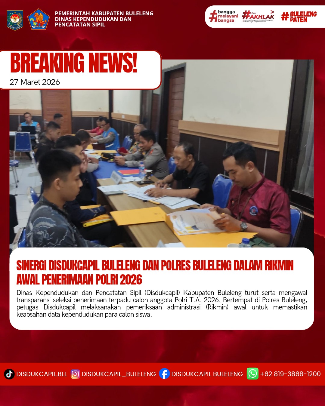 Buleleng, 27 Maret 2026 – Dinas Kependudukan dan Pencatatan Sipil (Disdukcapil) Kabupaten Buleleng turut serta mengawal transparansi seleksi penerimaan calon anggota Polri TA 2026. Bertempat di Polres Buleleng, petugas Disdukcapil melakukan pemeriksaan administrasi (Rikmin) awal untuk memastikan keabsahan data kependudukan para calon siswa.