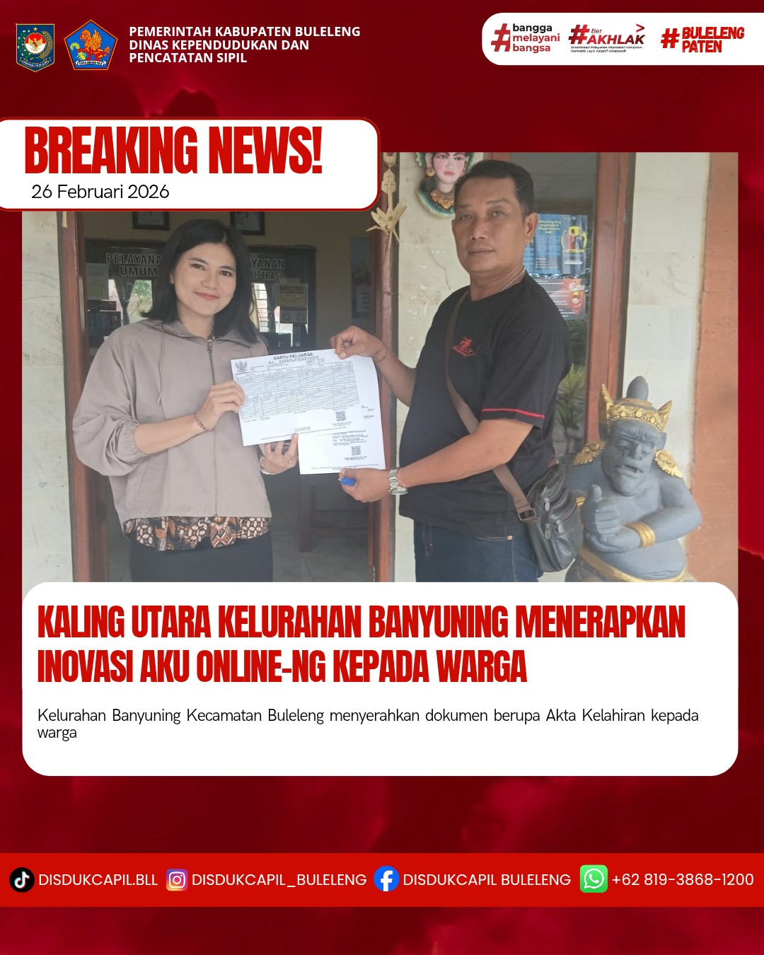 Pemerintah Kabupaten Buleleng melalui Dinas Kependudukan dan Pecatatan Sipil (Disdukcapil) Kabupaten Buleleng memaksimalkan serta mempermudah pelayanan kependudukan masyarakat dengan beberapa inovasi, melalui aplikasi AKU Online-NG. Dimana dalam penerapan aplikasi Aku Online-NG tersebut masyarakat tidak perlu lagi datang ke Dinas Dukcapil untuk melakukan pelayanan langsung cukup dengan datang ke Desa nanti akan dibantu oleh operator Desa masing-masing. Di Kelurahan Banyuning Kecamatan Buleleng, telah diserahkan dokumen kependudukan berupa Akta Kelahiran warga Kelurahan Banyuning yang diserahkan langsung oleh Kaling Utara Kelurahan Banyuning Kecamatan Buleleng, Kabupaten Buleleng, Kamis (26/2).