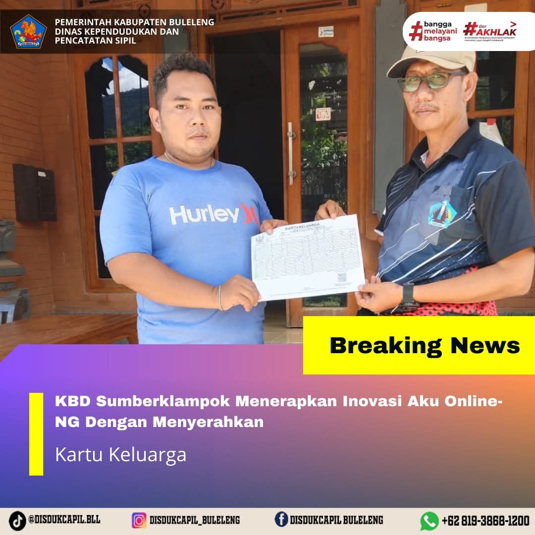 Pemerintah Kabupaten Buleleng melalui Dinas Kependudukan dan Pecatatan Sipil (Disdukcapil) Kabupaten Buleleng memaksimalkan serta mempermudah pelayanan kependudukan masyarakat dengan beberapa inovasi, melalui aplikasi AKU Online-NG. Dimana dalam penerapan aplikasi Aku Online-NG tersebut masyarakat tidak perlu lagi datang ke Dinas Dukcapil untuk melakukan pelayanan langsung cukup dengan datang ke Desa nanti akan dibantu oleh operator Desa masing-masing. Di Desa Sumberklampok Kecamatan Gerokgak, telah diserahkan dokumen kependudukan berupa Kartu Keluarga atas nama Istikomah yang diserahkan secara langsung oleh Kelian Banjar Dinas Sumberklampok Abusairi di Kantor Perbekel Desa Sumberklampok Kecamatan Gerokgak, Rabu (3/12).