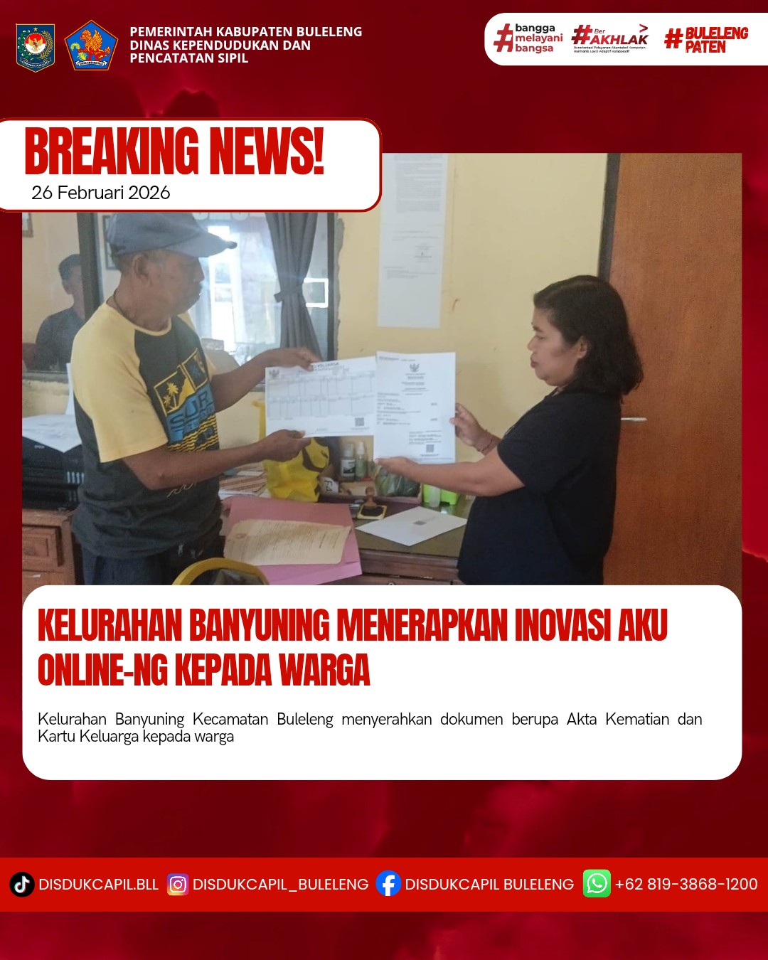 Pemerintah Kabupaten Buleleng melalui Dinas Kependudukan dan Pecatatan Sipil (Disdukcapil) Kabupaten Buleleng memaksimalkan serta mempermudah pelayanan kependudukan masyarakat dengan beberapa inovasi, melalui aplikasi AKU Online-NG. Dimana dalam penerapan aplikasi Aku Online-NG tersebut masyarakat tidak perlu lagi datang ke Dinas Dukcapil untuk melakukan pelayanan langsung cukup dengan datang ke Desa nanti akan dibantu oleh operator Desa masing-masing. Di Kelurahan Banyuning Kecamatan Buleleng, telah diserahkan dokumen kependudukan berupa Akta Kematian dan Kartu Keluarga warga Kelurahan Banyuning yang diserahkan langsung oleh staf Kelurahan Banyuning Kecamatan Buleleng, Kabupaten Buleleng, Kamis (26/2).