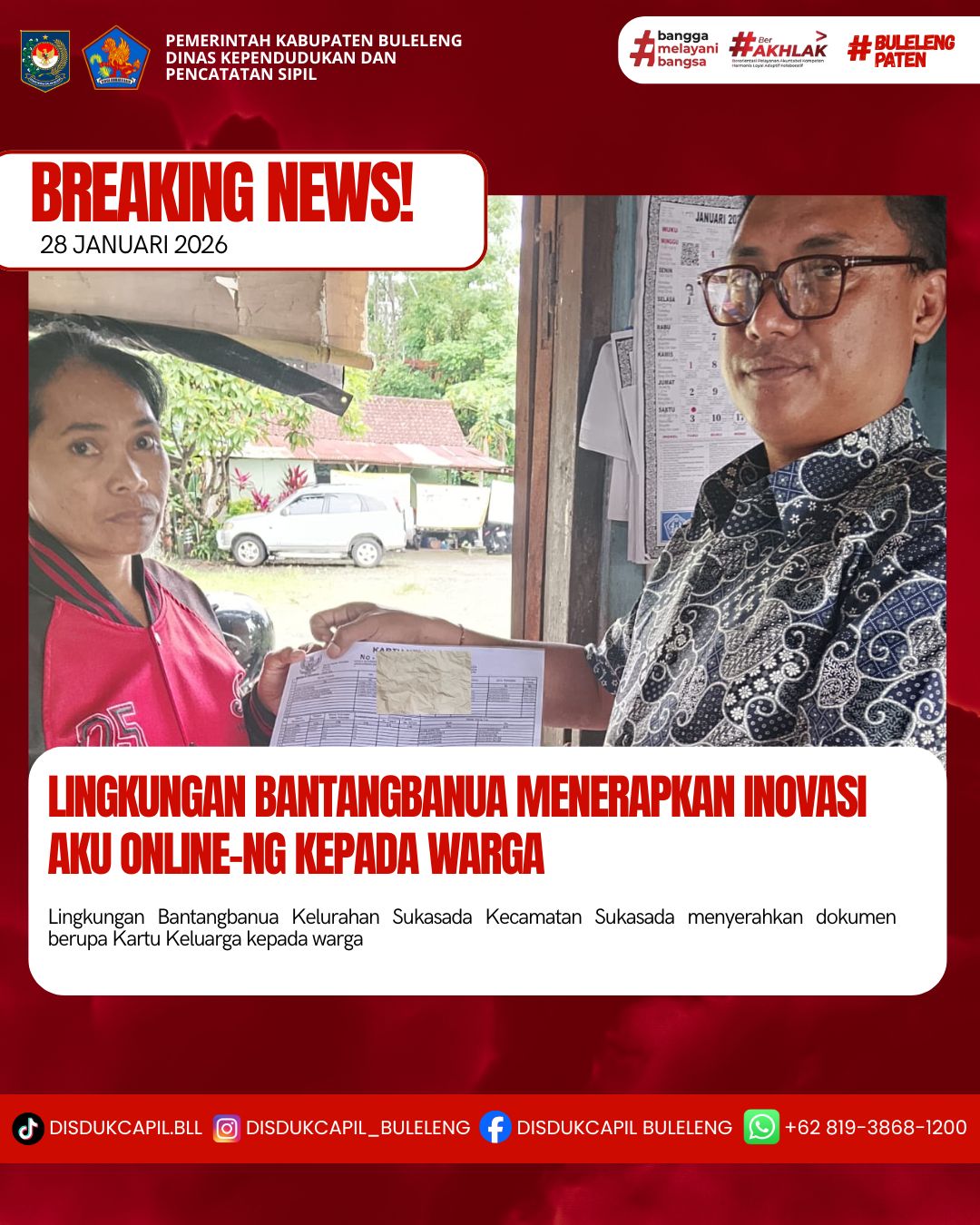 Pemerintah Kabupaten Buleleng melalui Dinas Kependudukan dan Pecatatan Sipil (Disdukcapil) Kabupaten Buleleng memaksimalkan serta mempermudah pelayanan kependudukan masyarakat dengan beberapa inovasi, melalui aplikasi AKU Online-NG. Dimana dalam penerapan aplikasi Aku Online-NG tersebut masyarakat tidak perlu lagi datang ke Dinas Dukcapil untuk melakukan pelayanan langsung cukup dengan datang ke Desa nanti akan dibantu oleh operator Desa masing-masing. Di Kelurahan Sukasada Kecamatan Sukasada, telah diserahkan dokumen kependudukan berupa Kartu Keluarga atas nama Kadek Suardana warga Lingkungan Bantangbanua, Kelurahan Sukasada yang diserahkan langsung oleh Kepala Lingkungan Bantangbanua Kelurahan Sukasada Kecamatan Sukasada, Kabupaten Buleleng, Rabu (28/1).