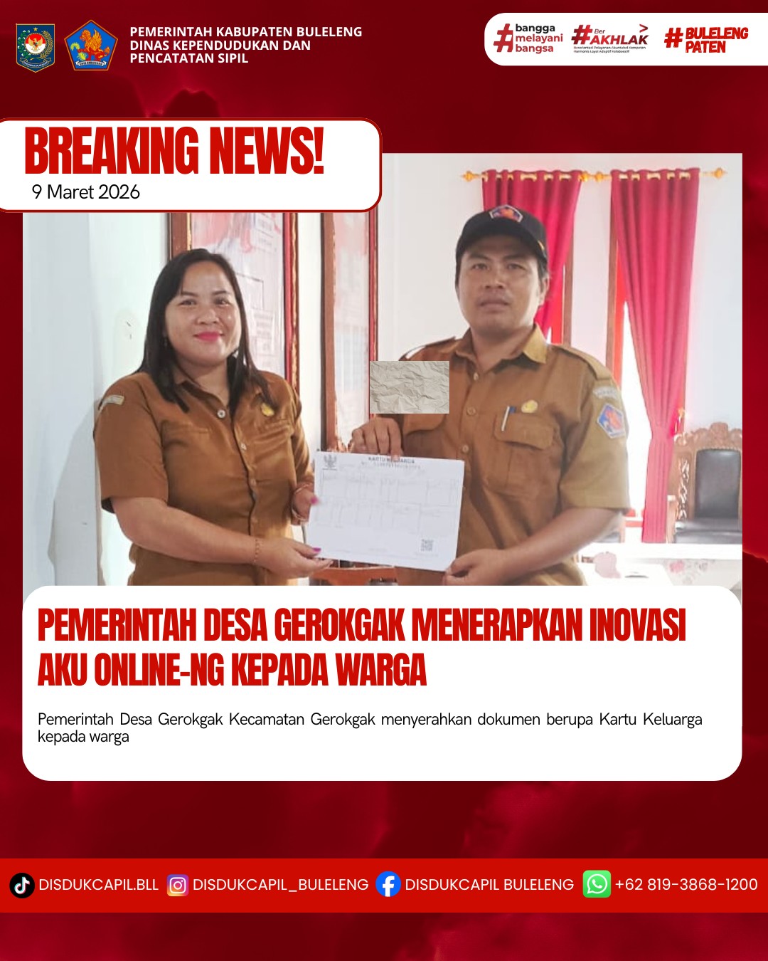 Pemerintah Kabupaten Buleleng melalui Dinas Kependudukan dan Pecatatan Sipil (Disdukcapil) Kabupaten Buleleng memaksimalkan serta mempermudah pelayanan kependudukan masyarakat dengan beberapa inovasi, melalui aplikasi AKU Online-NG. Dimana dalam penerapan aplikasi Aku Online-NG tersebut masyarakat tidak perlu lagi datang ke Dinas Dukcapil untuk melakukan pelayanan langsung cukup dengan datang ke Desa nanti akan dibantu oleh operator Desa masing-masing. Di Desa Gerokgak Kecamatan Gerokgak, telah diserahkan dokumen kependudukan berupa Kartu Keluarga atas nama Made Tomi Artawan yang diserahkan langsung oleh Operator Desa Gerokgak kepada Kelian Banjar Dinas Palbesi, Desa Gerokgak, Kecamatan Gerokgak, Kabupaten Buleleng, Senin (9/3).