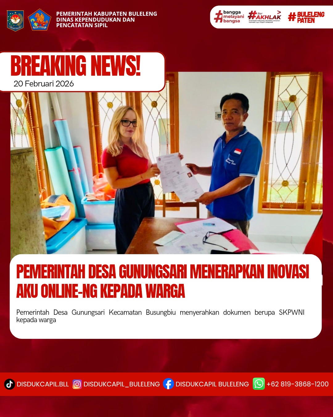 Pemerintah Kabupaten Buleleng melalui Dinas Kependudukan dan Pecatatan Sipil (Disdukcapil) Kabupaten Buleleng memaksimalkan serta mempermudah pelayanan kependudukan masyarakat dengan beberapa inovasi, melalui aplikasi AKU Online-NG. Dimana dalam penerapan aplikasi Aku Online-NG tersebut masyarakat tidak perlu lagi datang ke Dinas Dukcapil untuk melakukan pelayanan langsung cukup dengan datang ke Desa nanti akan dibantu oleh operator Desa masing-masing. Di Desa Gunungsari Kecamatan Seririt, telah diserahkan dokumen kependudukan berupa SKPWNI atas nama PUTU RAWINI warga Banjar Dinas Sekar, Desa Gunungsari akan pindah domisili ke Kelurahan Jimbaran, Kuta Selatan, Badung yang diserahkan oleh Pemerintah Desa Gunungsari kepada warga Banjar Dinas Sekar Desa Gunungsari, bertempat di Kantor Perbekel Desa Gunungsari, Kecamatan Seririt, Kabupaten Buleleng, Jumat (20/2).