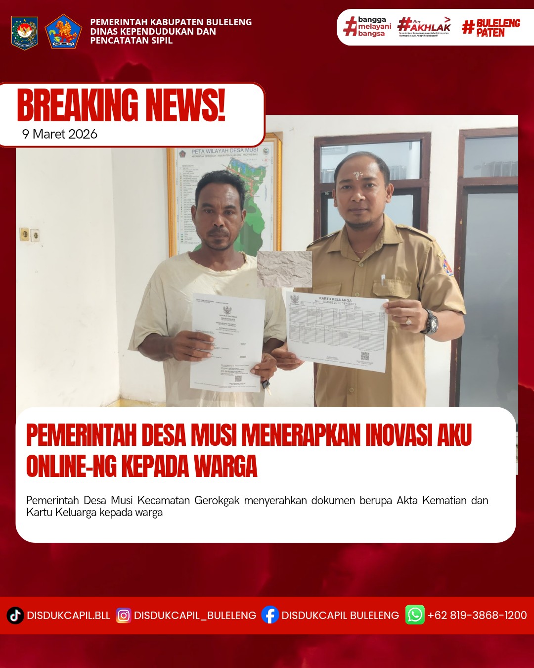 Pemerintah Kabupaten Buleleng melalui Dinas Kependudukan dan Pecatatan Sipil (Disdukcapil) Kabupaten Buleleng memaksimalkan serta mempermudah pelayanan kependudukan masyarakat dengan beberapa inovasi, melalui aplikasi AKU Online-NG. Dimana dalam penerapan aplikasi Aku Online-NG tersebut masyarakat tidak perlu lagi datang ke Dinas Dukcapil untuk melakukan pelayanan langsung cukup dengan datang ke Desa nanti akan dibantu oleh operator Desa masing-masing. Di Desa Musi Kecamatan Gerokgak, telah diserahkan dokumen kependudukan berupa Akta Kematian dan Kartu Keluarga yang diserahkan langsung oleh Kasi Pemerintahan Desa Musi Kecamatan Gerokgak, Kabupaten Buleleng, Senin (9/3).