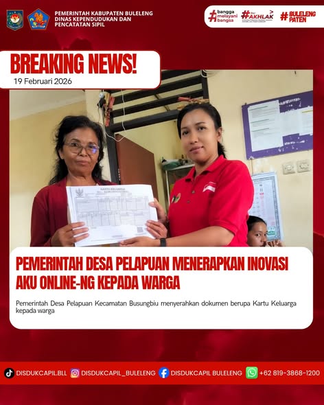 Pemerintah Kabupaten Buleleng melalui Dinas Kependudukan dan Pecatatan Sipil (Disdukcapil) Kabupaten Buleleng memaksimalkan serta mempermudah pelayanan kependudukan masyarakat dengan beberapa inovasi, melalui aplikasi AKU Online-NG. Dimana dalam penerapan aplikasi Aku Online-NG tersebut masyarakat tidak perlu lagi datang ke Dinas Dukcapil untuk melakukan pelayanan langsung cukup dengan datang ke Desa nanti akan dibantu oleh operator Desa masing-masing. Di Desa Pelapuan Kecamatan Busungbiu, telah diserahkan dokumen kependudukan berupa Kartu Keluarga atas nama I Dewa Made Suryadanawarga Desa Pelapuan yang diserahkan oleh Kasi Pemerintahan Desa Pelapuan bertempat di Kantor Perbekel Desa Pelapuan, Kecamatan Busungbiu, Kabupaten Buleleng, Kamis (19/2).