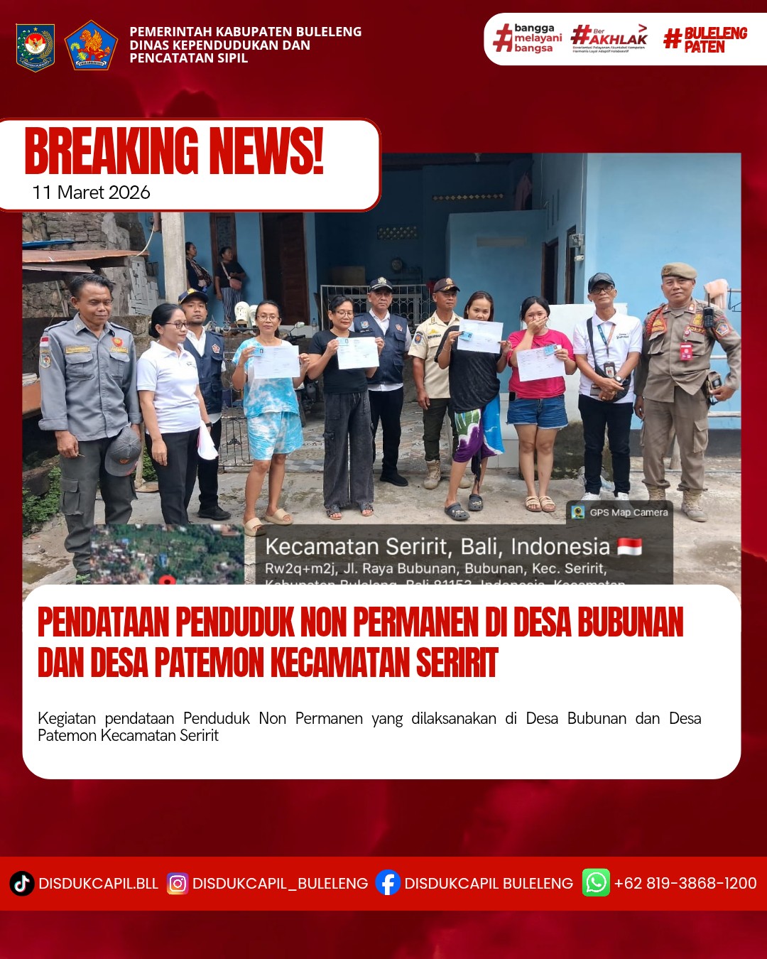 Kali ini Rabu, 11 Maret 2026, Dinas Kependudukan dan Pencatatan Sipil Kabupaten Buleleng melaksanakan kegiatan pendataan penduduk Non Permanen di Desa Bubunan dan Desa Patemon Kecamatan Seririt. Dari pendataan penduduk kali ini didapatkan hasil :