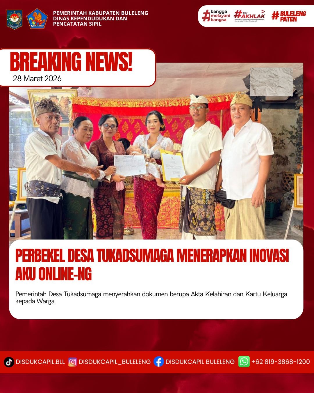 Pemerintah Kabupaten Buleleng melalui Dinas Kependudukan dan Pecatatan Sipil (Disdukcapil) Kabupaten Buleleng memaksimalkan serta mempermudah pelayanan kependudukan masyarakat dengan beberapa inovasi, melalui aplikasi AKU Online-NG. Dimana dalam penerapan aplikasi Aku Online-NG tersebut masyarakat tidak perlu lagi datang ke Dinas Dukcapil untuk melakukan pelayanan langsung, cukup dengan datang ke Desa nanti akan dibantu oleh operator Desa masing-masing. Di Desa Tukadsumaga Kecamatan Gerokgak, telah diserahkan dokumen kependudukan berupa Akta Kelahiran atas nama I Putu Kaelan Somesh Gunawan dan Kartu Keluarga atas nama I Kadek Risal Aldi Gunawan yang diserahkan oleh Perbekel Desa Tukadsumaga Anak Agung Sri Wathi didampingi oleh Kelian Banjar Dinas Buluh Ketut Artaya di Desa Tukadsumaga, Sabtu (28/3).