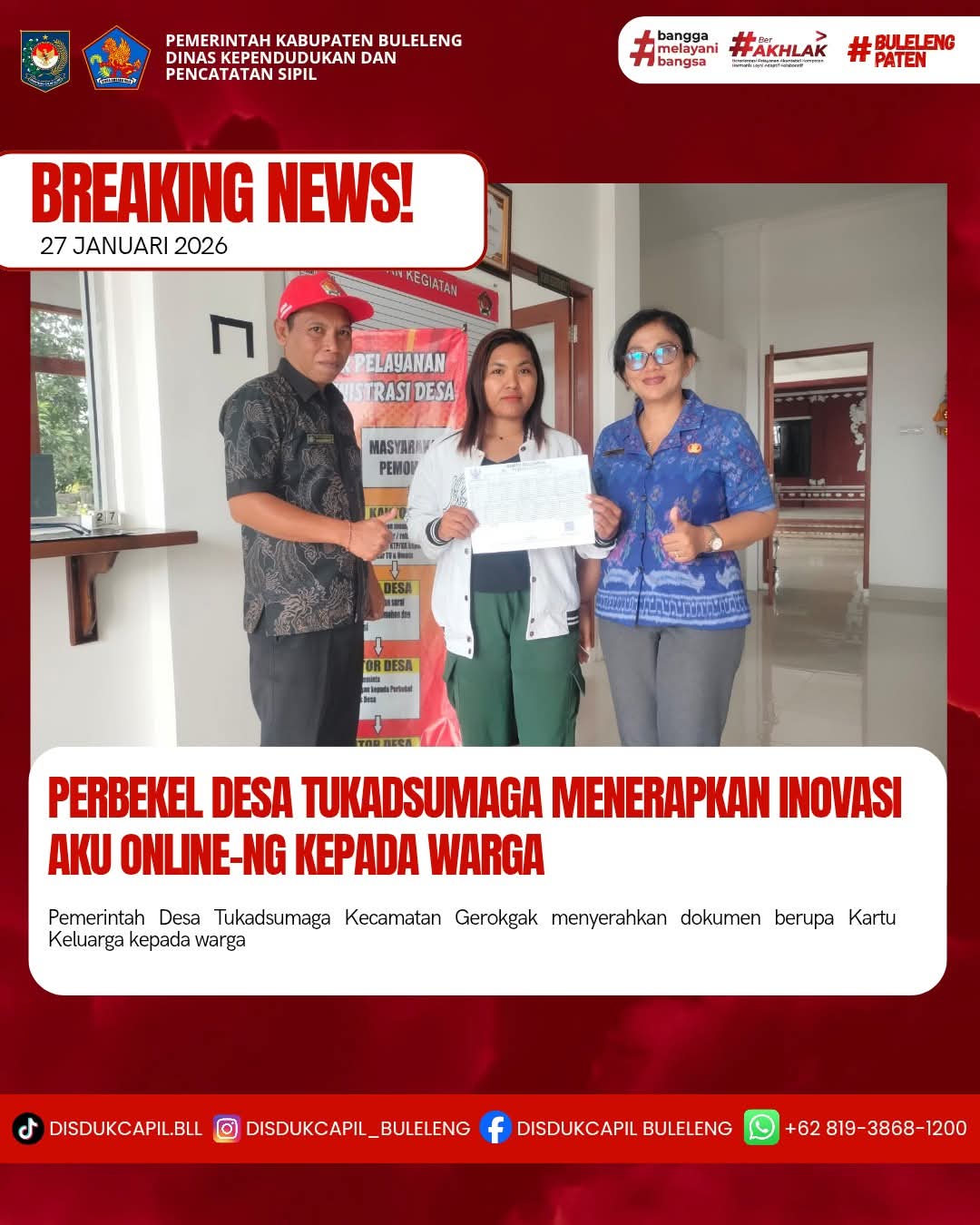 Pemerintah Kabupaten Buleleng melalui Dinas Kependudukan dan Pecatatan Sipil (Disdukcapil) Kabupaten Buleleng memaksimalkan serta mempermudah pelayanan kependudukan masyarakat dengan beberapa inovasi, melalui aplikasi AKU Online-NG. Dimana dalam penerapan aplikasi Aku Online-NG tersebut masyarakat tidak perlu lagi datang ke Dinas Dukcapil untuk melakukan pelayanan langsung cukup dengan datang ke Desa nanti akan dibantu oleh operator Desa masing-masing. Di Desa Tukadsumaga Kecamatan Gerokgak, telah diserahkan dokumen kependudukan berupa Kartu Keluarga atas nama Ni Luh Widiani warga Banjar Dinas Mawar yang diserahkan oleh Perbekel Desa Tukadsumaga Anak Agung Sri Wathi didampingi oleh Kelian Banjar Dinas Mawar I Kadek Edi P.Y di Desa Tukadsumaga, Selasa (27/1).