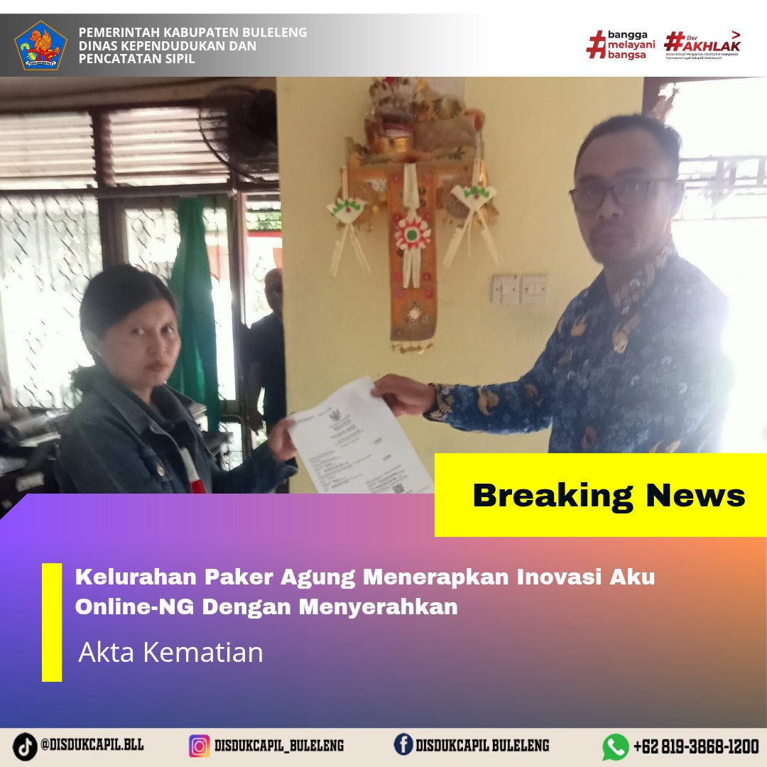 Pemerintah Kabupaten Buleleng melalui Dinas Kependudukan dan Pecatatan Sipil (Disdukcapil) Kabupaten Buleleng memaksimalkan serta mempermudah pelayanan kependudukan masyarakat dengan beberapa inovasi, melalui aplikasi AKU Online-NG. Dimana dalam penerapan aplikasi Aku Online-NG tersebut masyarakat tidak perlu lagi datang ke Dinas Dukcapil untuk melakukan pelayanan langsung cukup dengan datang ke Desa nanti akan dibantu oleh operator Desa masing-masing. Di Kelurahan Paket Agung Kecamatan Buleleng, telah diserahkan dokumen kependudukan berupa Akta Kematian atas nama Ida Bagus Rai Sudartha yang diserahkan langsung oleh Operator Kelurahan Paket Agung Kecamatan Buleleng bertempat di kantor Kelurahan Paket Agung Kecamatan Buleleng, Kabupaten Buleleng, Senin (17/11).