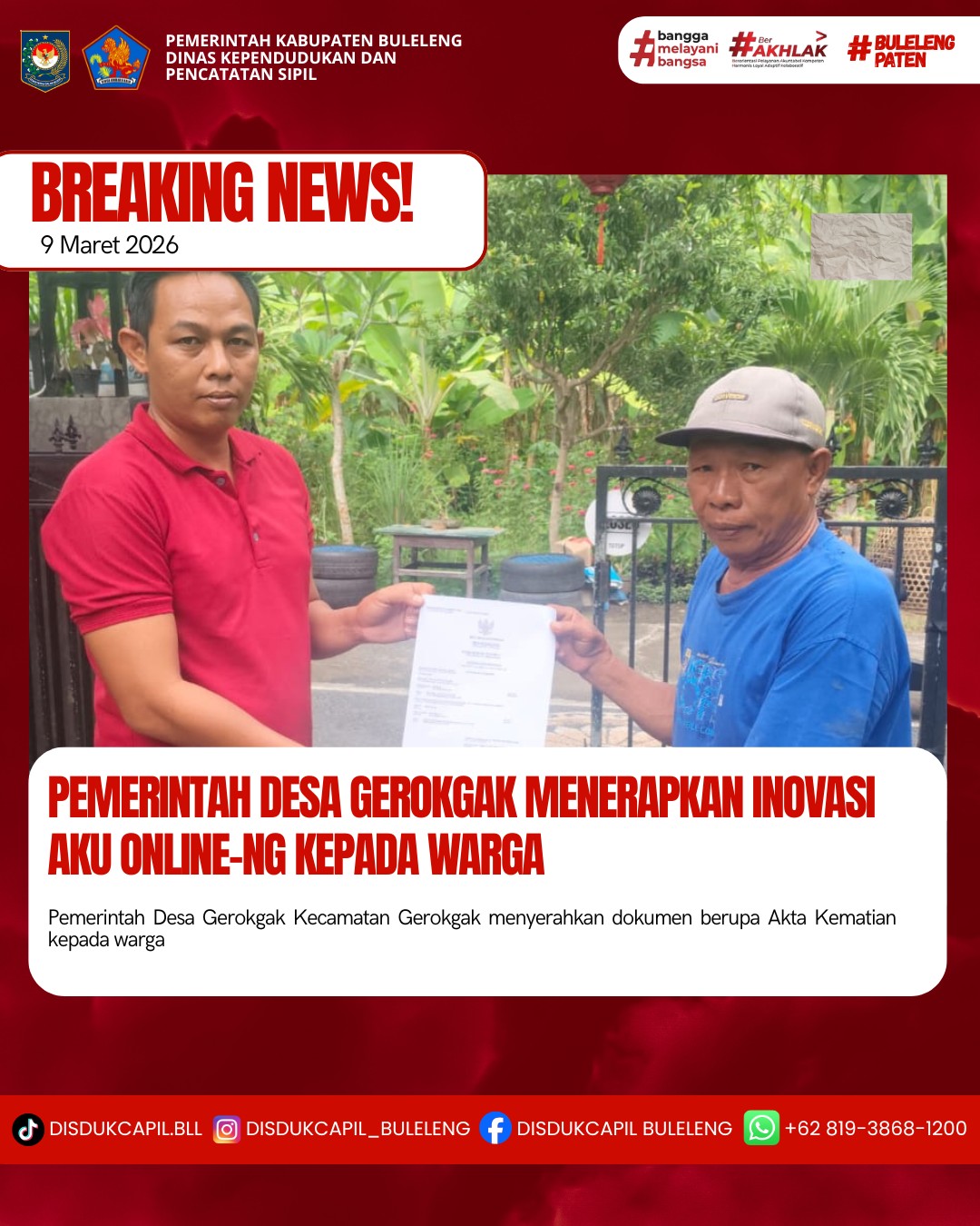Pemerintah Kabupaten Buleleng melalui Dinas Kependudukan dan Pecatatan Sipil (Disdukcapil) Kabupaten Buleleng memaksimalkan serta mempermudah pelayanan kependudukan masyarakat dengan beberapa inovasi, melalui aplikasi AKU Online-NG. Dimana dalam penerapan aplikasi Aku Online-NG tersebut masyarakat tidak perlu lagi datang ke Dinas Dukcapil untuk melakukan pelayanan langsung cukup dengan datang ke Desa nanti akan dibantu oleh operator Desa masing-masing. Di Desa Gerokgak Kecamatan Gerokgak, telah diserahkan dokumen kependudukan berupa Kartu Keluarga atas nama Nyoman Satria dan Kartu Keluarga atas nama Kadek Santri yg diserahkan langsung oleh Kelian Banjar Dinas Batuagung Pidada, Desa Gerokgak, Kecamatan Gerokgak, Kabupaten Buleleng, Senin (9/3).