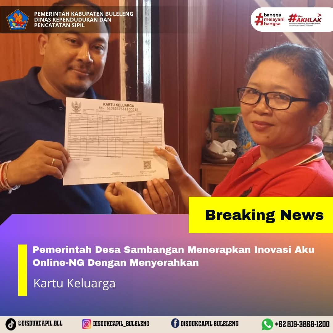 Pemerintah Kabupaten Buleleng melalui Dinas Kependudukan dan Pecatatan Sipil (Disdukcapil) Kabupaten Buleleng memaksimalkan serta mempermudah pelayanan kependudukan masyarakat dengan beberapa inovasi, melalui aplikasi AKU Online-NG. Dimana dalam penerapan aplikasi Aku Online-NG tersebut masyarakat tidak perlu lagi datang ke Dinas Dukcapil untuk melakukan pelayanan langsung cukup dengan datang ke Desa nanti akan dibantu oleh operator Desa masing-masing. Di Desa Sambangan Kecamatan Sukasada, telah diserahkan dokumen kependudukan berupa Kartu Keluarga atas nama Made Mustika yang diserahkan oleh Kasi Pemerintahan Desa Sambangan kepada warga Banjar Dinas Banjar Anyar bertempat di Kantor Perbekel Desa Sambangan, Kecamatan Sukasada, Kabupaten Buleleng, Jumat (12/12).
