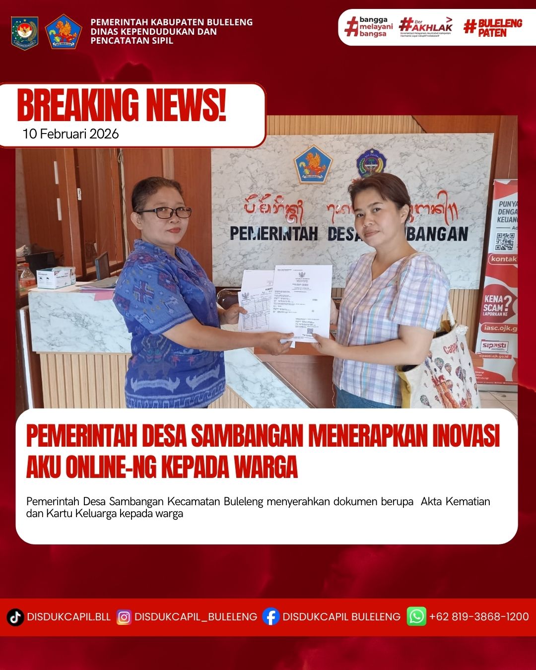 Pemerintah Kabupaten Buleleng melalui Dinas Kependudukan dan Pecatatan Sipil (Disdukcapil) Kabupaten Buleleng memaksimalkan serta mempermudah pelayanan kependudukan masyarakat dengan beberapa inovasi, melalui aplikasi AKU Online-NG. Dimana dalam penerapan aplikasi Aku Online-NG tersebut masyarakat tidak perlu lagi datang ke Dinas Dukcapil untuk melakukan pelayanan langsung cukup dengan datang ke Desa nanti akan dibantu oleh operator Desa masing-masing. Di Desa Sambangan Kecamatan Sukasada, telah diserahkan dokumen kependudukan berupa Akta Kematian atas nama Anzhar Andryanto dan Kartu Keluarga atas nama Dian Andryani diserahkan oleh Kasi Pemerintahan Desa Sambangan bertempat di Kantor Perbekel Desa Sambangan, Kecamatan Sukasada, Kabupaten Buleleng, Selasa (10/2).