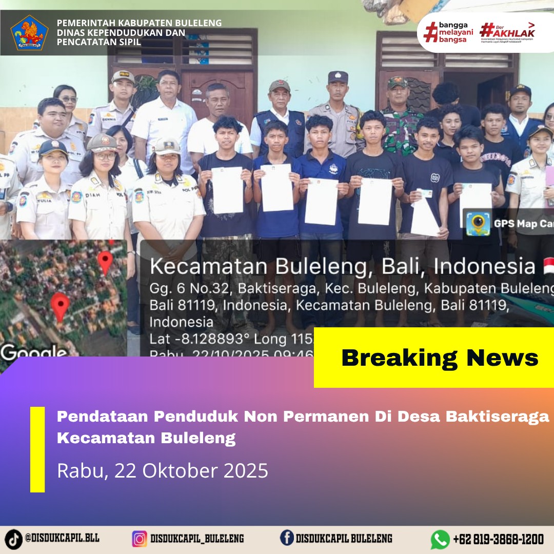 Kali ini Rabu, 22 Oktober 2025, Dinas Kependudukan dan Pencatatan Sipil Kabupaten Buleleng melaksanakan kegiatan pendataan penduduk Non Permanen di Desa Baktiseraga Kecamatan Buleleng. Dari pendataan penduduk kali ini didapatkan hasil :
