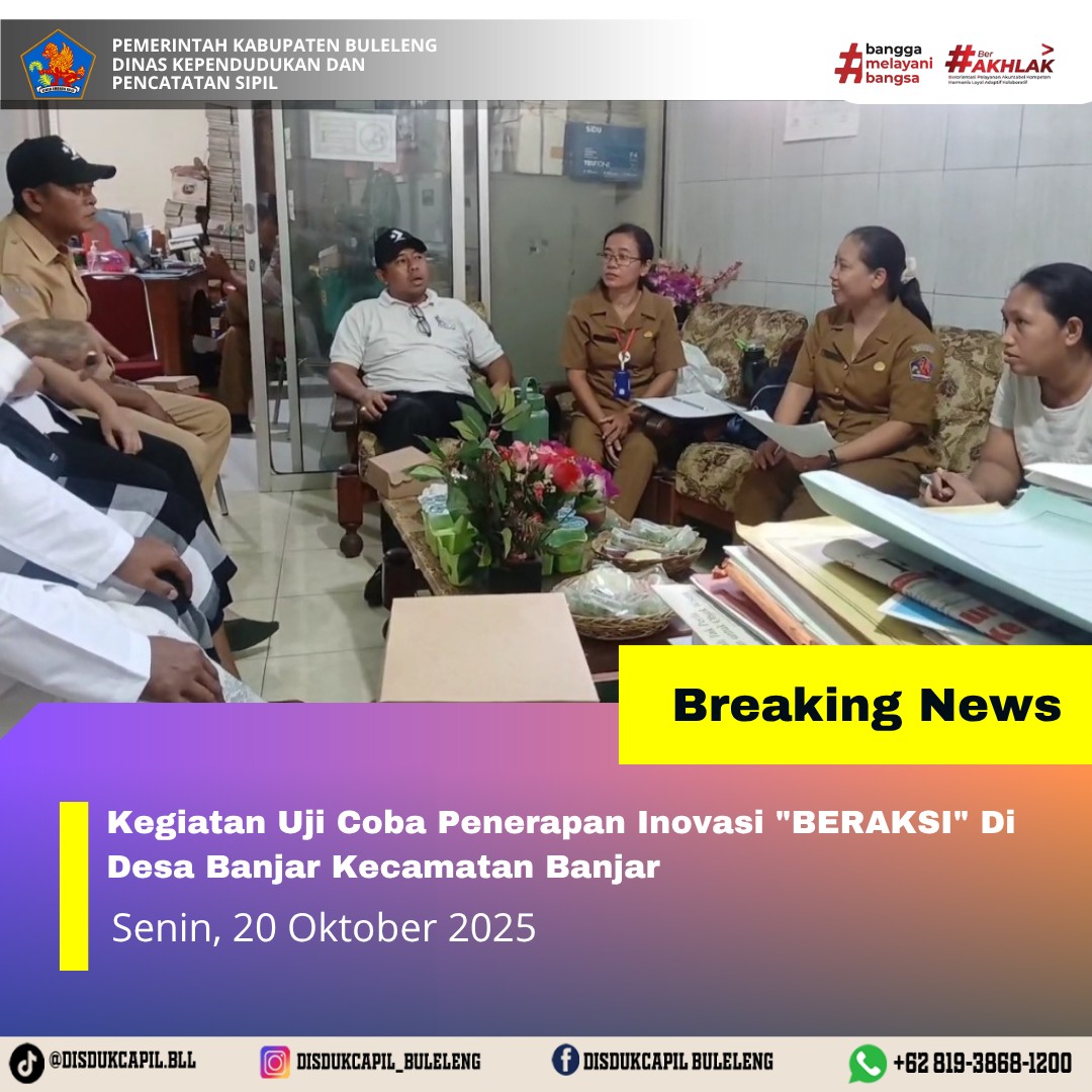 Kepala Bidang Pelayanan dan Pencatatan Sipil Disdukcapil Kabupaten Buleleng melaksanakan kegiatan uji coba penerapan Inovasi "BERAKSI" Di Desa Banjar Kecamatan Banjar. Inovasi "BERAKSI" (Bertemu Warga Untuk Konsultasi dan Memberi Solusi) merupakan Inovasi baru di Disdukcapil Buleleng sebagai upaya membantu masyarakat dalam memberikan solusi dalam mengatasi permasalahan administrasi kependudukan dengan datang ke Desa dan langsung bertemu dengan masyarakat.
