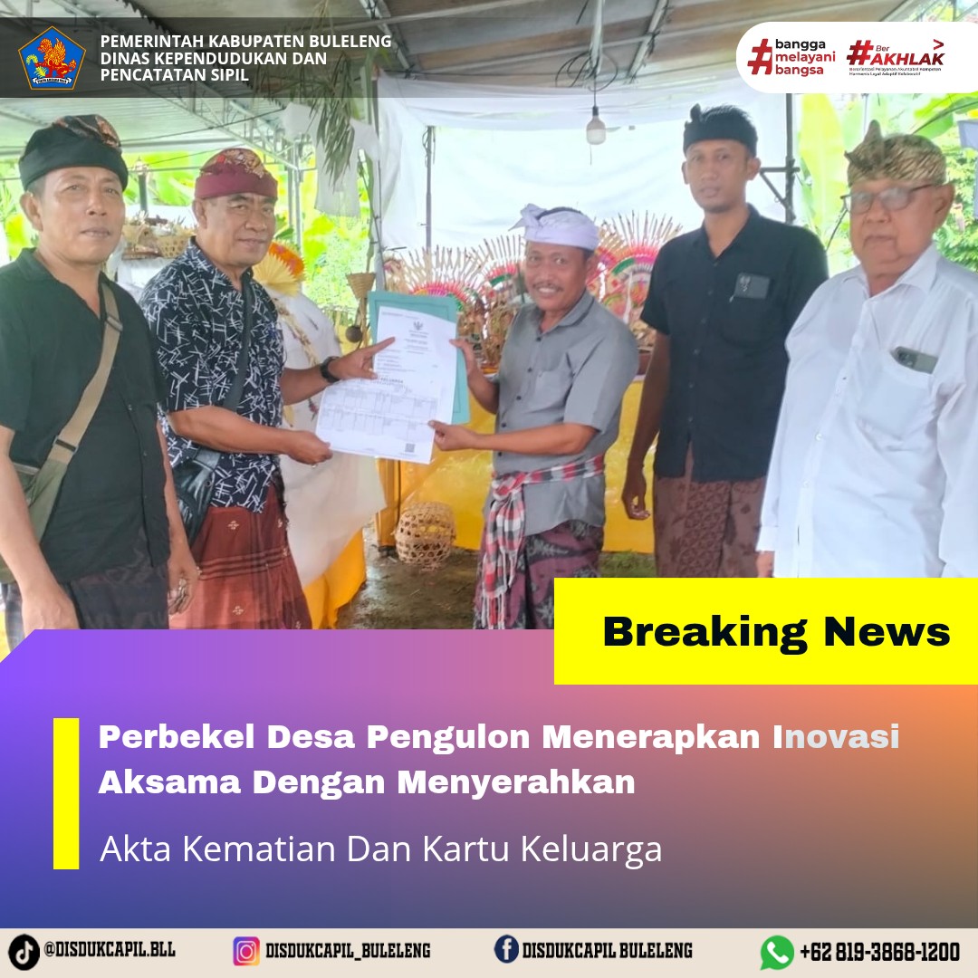 Pemerintah Kabupaten Buleleng melalui Dinas Kependudukan dan Pecatatan Sipil (Disdukcapil) Kabupaten Buleleng memaksimalkan serta mempermudah pelayanan kependudukan masyarakat dengan beberapa inovasi, yakni BALITA (Bayi Lahir Berakta), NYAKSI (Menyerahkan Akta Kawin Saat Acara Perkawinan) dan AKSAMA ( Akta Kematian Diserahkan Saat Masih Berduka) melalui aplikasi Aku Online. Di Desa Pengulon Kecamatan Gerokgak, telah diterapkan program Aksama (Akta Kematian Diserahkan Saat Masih Berduka) yang dilakukan secara langsung oleh Perbekel Desa Pengulon Drs. I Nyoman Juliana didampingi KBD. Munduk Sari, KBD. Bukit Sari, Kelian Subak Sawah dengan menyerahkan Akta Kematian atas nama Ketut Nik dan Kartu Keluarga atas nama Luh Mangku kepada warga yang diterima oleh KBA. Tegallantang di Desa Pengulon Kecamatan Gerokgak, Kamis (23/1).