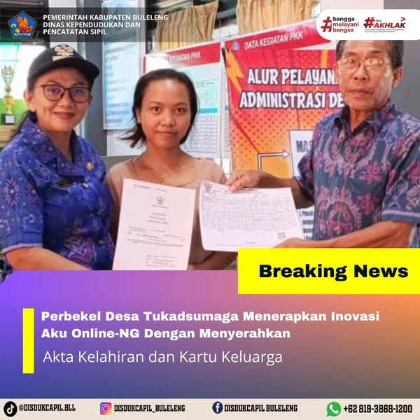 Pemerintah Kabupaten Buleleng melalui Dinas Kependudukan dan Pecatatan Sipil (Disdukcapil) Kabupaten Buleleng memaksimalkan serta mempermudah pelayanan kependudukan masyarakat dengan beberapa inovasi, melalui aplikasi AKU Online. Dimana dalam penerapan aplikasi Aku Online tersebut masyarakat tidak perlu lagi datang ke Dinas Dukcapil untuk melakukan pelayanan langsung cukup dengan datang ke Desa nanti akan dibantu oleh operator Desa masing-masing. Di Desa Tukadsumaga Kecamatan Gerokgak telah diserahkan dokumen kependudukan berupa Akta Kelahiran dan Kartu Keluarga atas nama Ni Luh Aprilliani Cahaya Dewi warga Banjar Dinas Berawah Desa Tukadsumaga oleh Perbekel Desa Tukadsumaga, Kecamatan Gerokgak, Selasa (26/8).