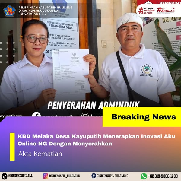 Pemerintah Kabupaten Buleleng melalui Dinas Kependudukan dan Pecatatan Sipil (Disdukcapil) Kabupaten Buleleng memaksimalkan serta mempermudah pelayanan kependudukan masyarakat dengan beberapa inovasi, melalui aplikasi AKU Online-NG. Dimana dalam penerapan aplikasi Aku Online-NG tersebut masyarakat tidak perlu lagi datang ke Dinas Dukcapil untuk melakukan pelayanan langsung cukup dengan datang ke Desa nanti akan dibantu oleh operator Desa masing-masing. Di Desa Kayuputih Kecamatan Sukasada, telah diserahkan dokumen kependudukan berupa Akta Kematian atas nama Ketut Suwera yang diserahkan langsung oleh KBD Melaka Desa Kayuputih Kecamatan Sukasada bertempat di kantor Perbekel Desa Kayuputih, Kecamatan Sukasada, Kabupaten Buleleng, Rabu (27/8).