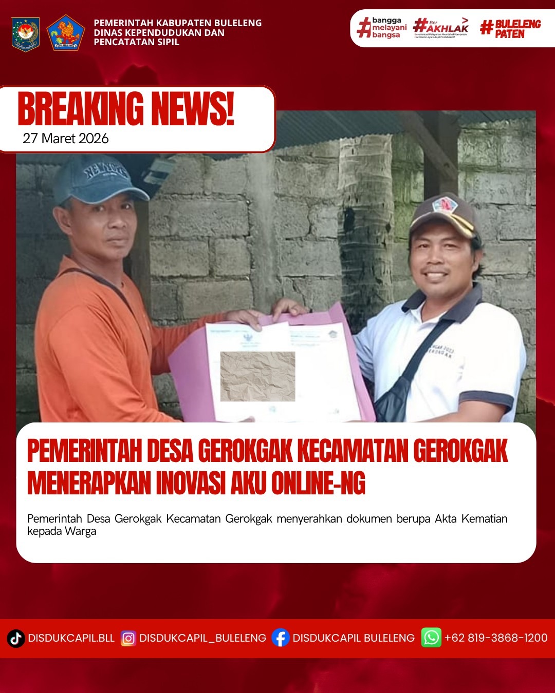 Pemerintah Kabupaten Buleleng melalui Dinas Kependudukan dan Pecatatan Sipil (Disdukcapil) Kabupaten Buleleng memaksimalkan serta mempermudah pelayanan kependudukan masyarakat dengan beberapa inovasi, melalui aplikasi AKU Online-NG. Dimana dalam penerapan aplikasi Aku Online-NG tersebut masyarakat tidak perlu lagi datang ke Dinas Dukcapil untuk melakukan pelayanan langsung, cukup dengan datang ke Desa nanti akan dibantu oleh operator Desa masing-masing. Di Desa Gerokgak Kecamatan Gerokgak, telah diserahkan dokumen kependudukan berupa Akta Kematian atas nama Luh Wari yang diserahkan langsung oleh Kelian Banjar Dinas Palbesi Desa Gerokgak di Desa Gerokgak, Kecamatan Gerokgak, Kabupaten Buleleng, Jumat (27/3).