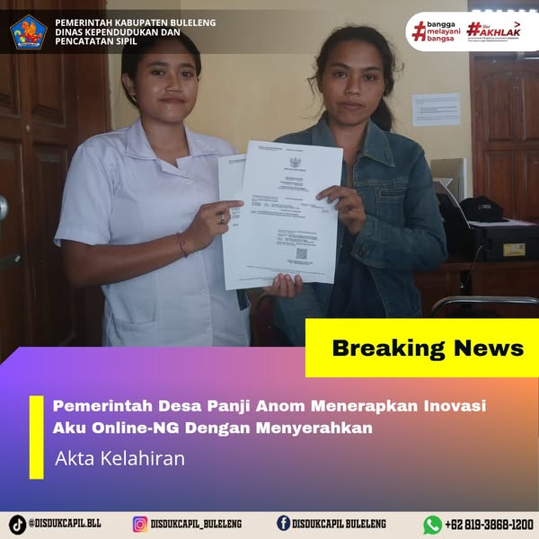 Pemerintah Kabupaten Buleleng melalui Dinas Kependudukan dan Pecatatan Sipil (Disdukcapil) Kabupaten Buleleng memaksimalkan serta mempermudah pelayanan kependudukan masyarakat dengan beberapa inovasi, melalui aplikasi AKU Online-NG. Dimana dalam penerapan aplikasi Aku Online-NG tersebut masyarakat tidak perlu lagi datang ke Dinas Dukcapil untuk melakukan pelayanan langsung cukup dengan datang ke Desa nanti akan dibantu oleh operator Desa masing-masing. Di Desa Panji Anom Kecamatan Sukasada, telah diserahkan dokumen kependudukan berupa Akta Kelahiran atas nama Kadek Della Rosalina dan Putu Desta Adi Putra yang diserahkan secara langsung oleh Operator Desa Panji Anom , Rabu (1/10).
