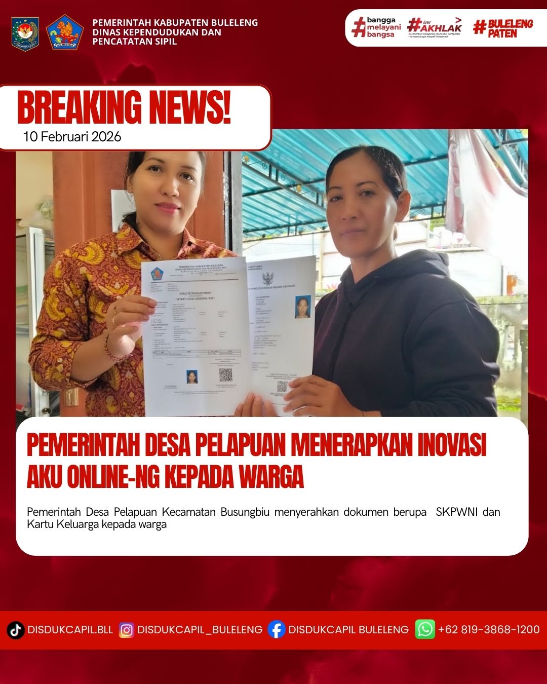 Pemerintah Kabupaten Buleleng melalui Dinas Kependudukan dan Pecatatan Sipil (Disdukcapil) Kabupaten Buleleng memaksimalkan serta mempermudah pelayanan kependudukan masyarakat dengan beberapa inovasi, melalui aplikasi AKU Online-NG. Dimana dalam penerapan aplikasi Aku Online-NG tersebut masyarakat tidak perlu lagi datang ke Dinas Dukcapil untuk melakukan pelayanan langsung cukup dengan datang ke Desa nanti akan dibantu oleh operator Desa masing-masing. Di Desa Pelapuan Kecamatan Busungbiu, telah diserahkan dokumen kependudukan berupa SKPWNI antar Kabupaten atas nama Luh Antiningsih dan Kartu Keluarga warga Desa Pelapuan yang diserahkan oleh Kasi Pemerintahan Desa Pelapuan bertempat di Kantor Perbekel Desa Pelapuan, Kecamatan Busungbiu, Kabupaten Buleleng, Selasa (10/2).