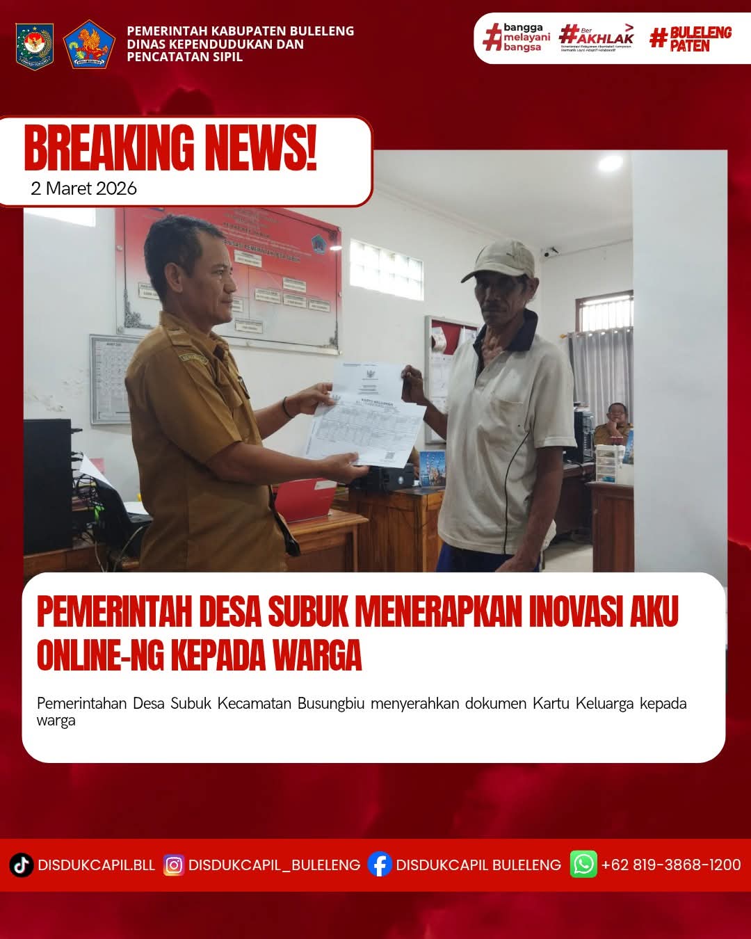 Pemerintah Kabupaten Buleleng melalui Dinas Kependudukan dan Pecatatan Sipil (Disdukcapil) Kabupaten Buleleng memaksimalkan serta mempermudah pelayanan kependudukan masyarakat dengan beberapa inovasi, melalui aplikasi AKU Online-NG. Dimana dalam penerapan aplikasi Aku Online-NG tersebut masyarakat tidak perlu lagi datang ke Dinas Dukcapil untuk melakukan pelayanan langsung cukup dengan datang ke Desa nanti akan dibantu oleh operator Desa masing-masing. Di Desa Subuk Kecamatan Busungbiu, telah diserahkan dokumen kependudukan berupa Kartu Keluarga atas nama Ketut Sekawan diserahkan oleh Kadus Desa Subuk I Gede Wirawan bertempat di Kantor Perbekel Desa Subuk, Kecamatan Busungbiu, Kabupaten Buleleng, Senin (2/3).