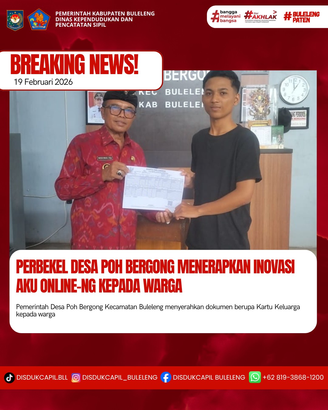 Pemerintah Kabupaten Buleleng melalui Dinas Kependudukan dan Pecatatan Sipil (Disdukcapil) Kabupaten Buleleng memaksimalkan serta mempermudah pelayanan kependudukan masyarakat dengan beberapa inovasi, melalui aplikasi AKU Online. Dimana dalam penerapan aplikasi Aku Online tersebut masyarakat tidak perlu lagi datang ke Dinas Dukcapil untuk melakukan pelayanan langsung cukup dengan datang ke Desa nanti akan dibantu oleh operator Desa masing-masing. Di Desa Poh Bergong Kecamatan Buleleng telah diserahkan dokumen kependudukan berupa Kartu Keluarga yang diserahkan langsung oleh Perbekel Desa Poh Bergong Kecamatan Buleleng Wayan Wagia, S.Sos, Kamis (19/2).