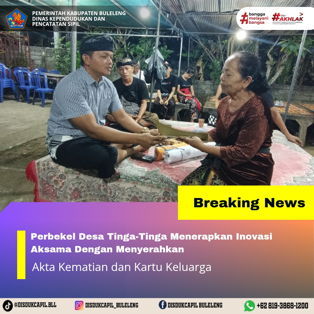 Pemerintah Kabupaten Buleleng melalui Dinas Kependudukan dan Pecatatan Sipil (Disdukcapil) Kabupaten Buleleng memaksimalkan serta mempermudah pelayanan kependudukan masyarakat dengan beberapa inovasi, yakni BALITA (Bayi Lahir Berakta), NYAKSI (Menyerahkan Akta Kawin Saat Acara Perkawinan) dan AKSAMA ( Akta Kematian Diserahkan Saat Masih Berduka) melalui aplikasi Aku Online. Di Desa Tinga-Tinga Kecamatan Gerokgak, telah diterapkan program Aksama (Akta Kematian Diserahkan Saat Masih Berduka) yang dilakukan secara langsung oleh Perbekel Desa Tinga-Tinga I Komang Adi Wirawan dengan menyerahkan Akta Kematian atas nama Nyoman Gede Adnyana dan Kartu Keluarga kepada keluarga almarhum di Banjar Dinas Bubunan Desa Tinga-tinga, Kecamatan Gerokgak, Selasa (4/11).