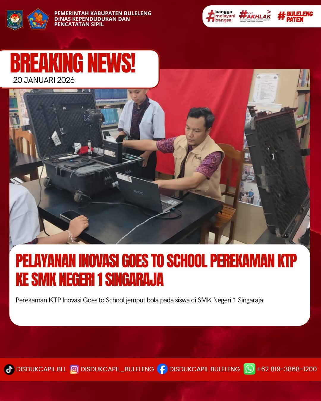 Pada kali ini Selasa, 20 Januari 2026 pelayanan perekaman KTP-el dilaksanakan di SMK Negeri 1 Singaraja. Hasil perekaman di SMK Negeri 1 Singaraja dengan data BNBA sebanyak 385 orang dan total yang melakukan perekaman sebanyak 121 orang, dimana hasil perekaman data di dalam BNBA sebanyak 116 orang dan data di luar BNBA sebanyak 5 orang yang melakukan perekaman. Dilihat dari hasil tersebut sisa data BNBA yang belum perekaman sebanyak 269 orang dimana terdapat kendala pengajuan perekaman mengalami gangguan maka perekaman sisanya dijadwalkan kembali di hari berikutnya.