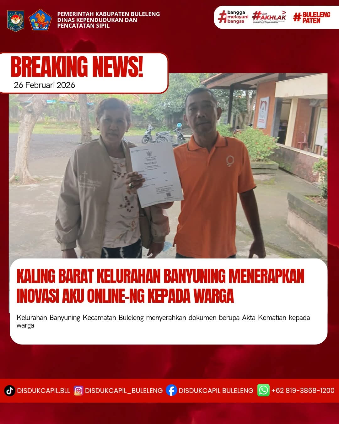 Pemerintah Kabupaten Buleleng melalui Dinas Kependudukan dan Pecatatan Sipil (Disdukcapil) Kabupaten Buleleng memaksimalkan serta mempermudah pelayanan kependudukan masyarakat dengan beberapa inovasi, melalui aplikasi AKU Online-NG. Dimana dalam penerapan aplikasi Aku Online-NG tersebut masyarakat tidak perlu lagi datang ke Dinas Dukcapil untuk melakukan pelayanan langsung cukup dengan datang ke Desa nanti akan dibantu oleh operator Desa masing-masing. Di Kelurahan Banyuning Kecamatan Buleleng, telah diserahkan dokumen kependudukan berupa Akta Kematian warga Kelurahan Banyuning yang diserahkan langsung oleh Kaling Barat Kelurahan Banyuning Kecamatan Buleleng, Kabupaten Buleleng, Kamis (26/2).