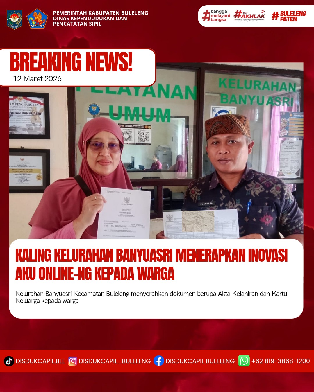 Pemerintah Kabupaten Buleleng melalui Dinas Kependudukan dan Pecatatan Sipil (Disdukcapil) Kabupaten Buleleng memaksimalkan serta mempermudah pelayanan kependudukan masyarakat dengan beberapa inovasi, melalui aplikasi AKU Online-NG. Dimana dalam penerapan aplikasi Aku Online-NG tersebut masyarakat tidak perlu lagi datang ke Dinas Dukcapil untuk melakukan pelayanan langsung cukup dengan datang ke Desa nanti akan dibantu oleh operator Desa masing-masing. Di Kelurahan Banyuasri Kecamatan Buleleng, telah diserahkan dokumen kependudukan berupa Akta Kelahiran atas nama Mujiyanti dan Kartu Keluarga yang diserahkan langsung oleh Kaling Kelurahan Banyuasri, Kecamatan Buleleng, Kabupaten Buleleng, Kamis (12/3).