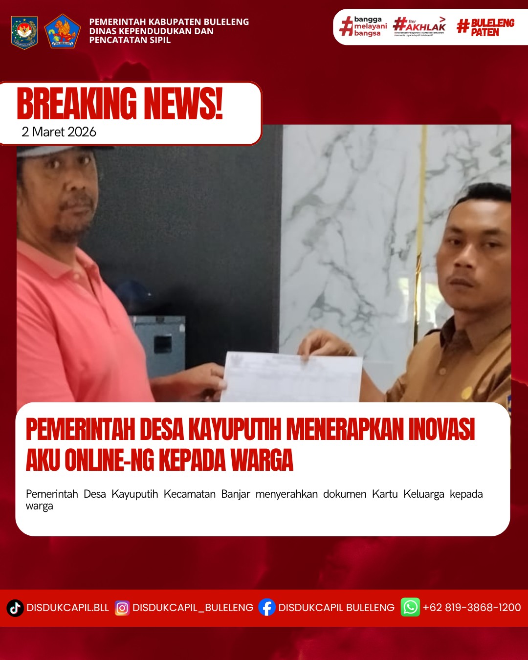Pemerintah Kabupaten Buleleng melalui Dinas Kependudukan dan Pecatatan Sipil (Disdukcapil) Kabupaten Buleleng memaksimalkan serta mempermudah pelayanan kependudukan masyarakat dengan beberapa inovasi, melalui aplikasi AKU Online-NG. Dimana dalam penerapan aplikasi Aku Online-NG tersebut masyarakat tidak perlu lagi datang ke Dinas Dukcapil untuk melakukan pelayanan langsung cukup dengan datang ke Desa nanti akan dibantu oleh operator Desa masing-masing. Di Desa Kayuputih Kecamatan Banjar, telah diserahkan dokumen kependudukan berupa Kartu Keluarga atas nama Ida Bagus Suija warga Banjar Dinas Taman Desa Kayuputih yang diserahkan secara langsung oleh Pemerintah Desa Kayuputih Kecamatan Banjar, Senin (2/3).