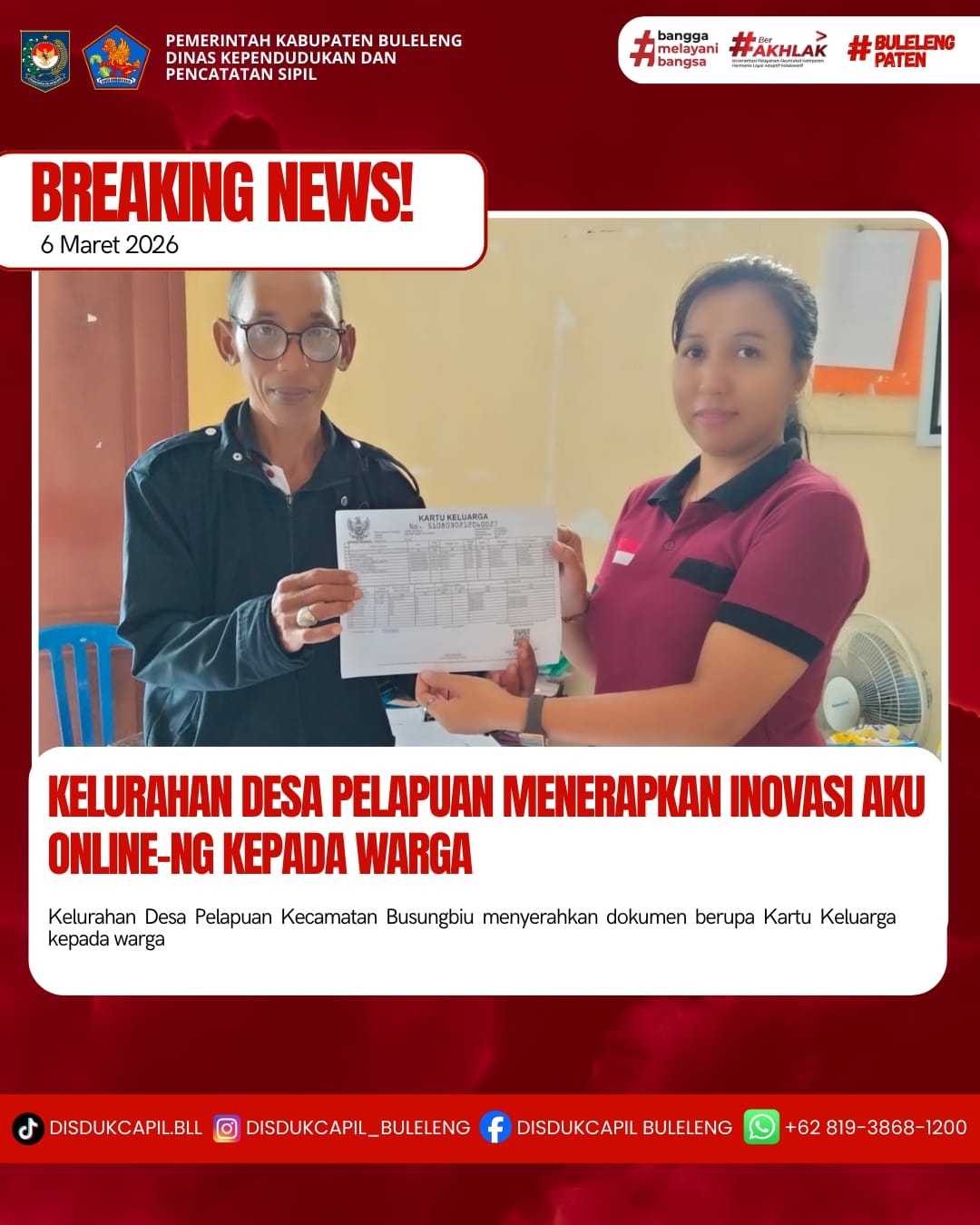 Pemerintah Kabupaten Buleleng melalui Dinas Kependudukan dan Pecatatan Sipil (Disdukcapil) Kabupaten Buleleng memaksimalkan serta mempermudah pelayanan kependudukan masyarakat dengan beberapa inovasi, melalui aplikasi AKU Online-NG. Dimana dalam penerapan aplikasi Aku Online-NG tersebut masyarakat tidak perlu lagi datang ke Dinas Dukcapil untuk melakukan pelayanan langsung cukup dengan datang ke Desa nanti akan dibantu oleh operator Desa masing-masing. Di Desa Pelapuan Kecamatan Busungbiu, telah diserahkan dokumen kependudukan berupa Kartu Keluarga atas nama Gede Setiasa warga Desa Pelapuan yang diserahkan oleh Kasi Pemerintahan Desa Pelapuan bertempat di Kantor Perbekel Desa Pelapuan, Kecamatan Busungbiu, Kabupaten Buleleng, Jumat (6/3).