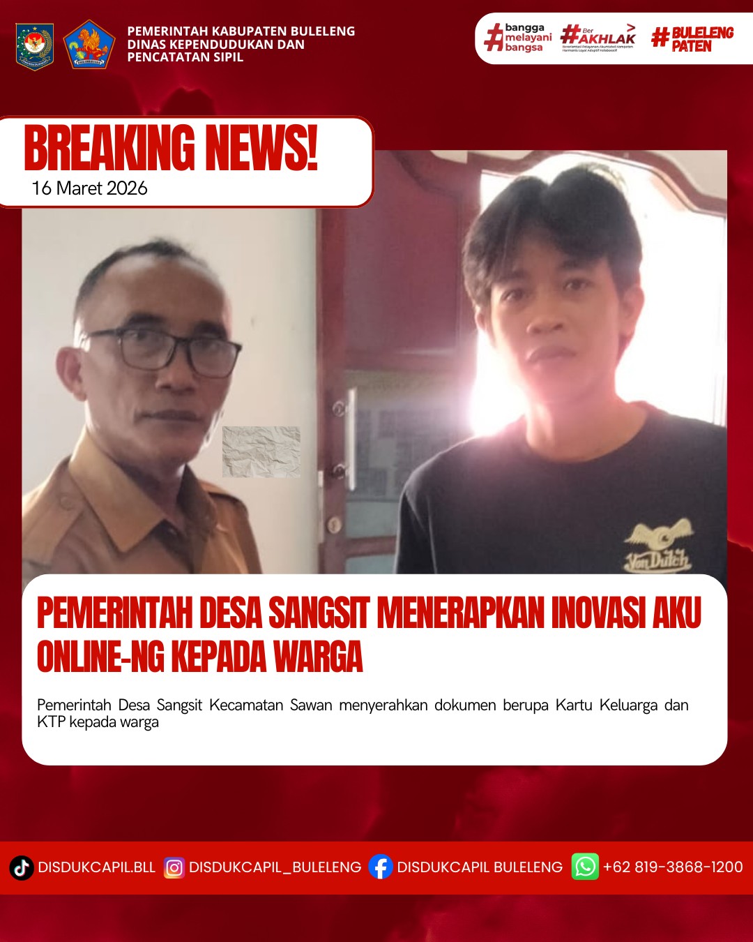 Pemerintah Kabupaten Buleleng melalui Dinas Kependudukan dan Pecatatan Sipil (Disdukcapil) Kabupaten Buleleng memaksimalkan serta mempermudah pelayanan kependudukan masyarakat dengan beberapa inovasi, melalui aplikasi AKU Online-NG. Dimana dalam penerapan aplikasi Aku Online-NG tersebut masyarakat tidak perlu lagi datang ke Dinas Dukcapil untuk melakukan pelayanan langsung cukup dengan datang ke Desa nanti akan dibantu oleh operator Desa masing-masing. Di Desa Sanggalangit Kecamatan Gerokgak, telah diserahkan dokumen kependudukan berupa Kartu Keluarga dan KTP-El kepada warga atas nama Kadek Sentana Putra warga Banjar Dinas Beji, Desa Sangsit Kecamatan Sawan yang diserahkan langsung oleh Kelian Banjar Dinas Beji, Desa Sangsit, Senin (16/3).