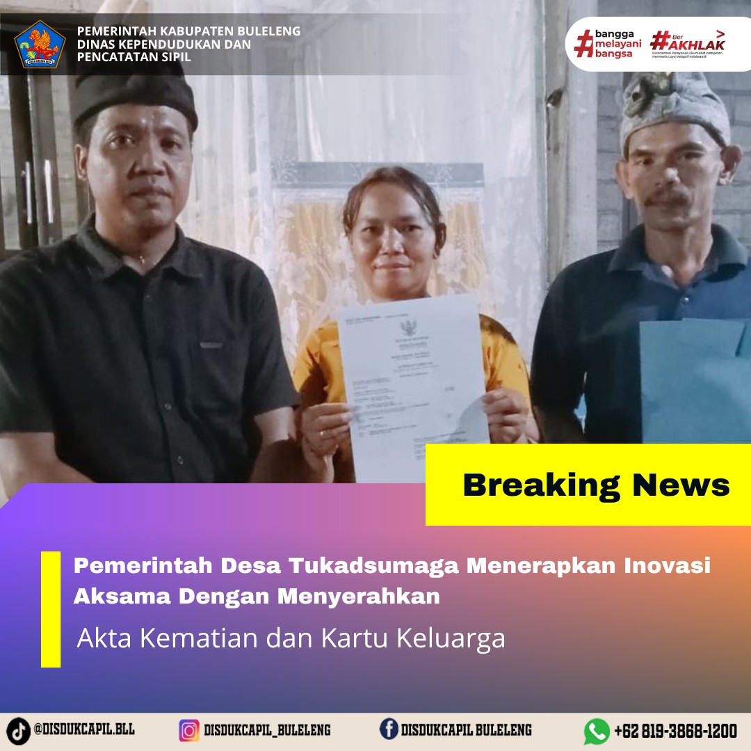 Pemerintah Kabupaten Buleleng melalui Dinas Kependudukan dan Pecatatan Sipil (Disdukcapil) Kabupaten Buleleng memaksimalkan serta mempermudah pelayanan kependudukan masyarakat dengan beberapa inovasi, yakni BALITA (Bayi Lahir Berakta), NYAKSI (Menyerahkan Akta Kawin Saat Acara Perkawinan) dan AKSAMA ( Akta Kematian Diserahkan Saat Masih Berduka) melalui aplikasi Aku Online. Di Desa Tukadsumaga Kecamatan Gerokgak, telah diterapkan program Aksama (Akta Kematian Diserahkan Saat Masih Berduka) yang dilakukan secara langsung oleh Kelian Banjar Dinas Yehmas Desa Tukadsumaga dengan menyerahkan Akta Kematian atas nama NI NYOMAN CANANG dan Kartu Keluarga kepada pihak keluarga almarhum di Desa Tukadusumaga Kecamatan Gerokgak, Jumat (24/10).