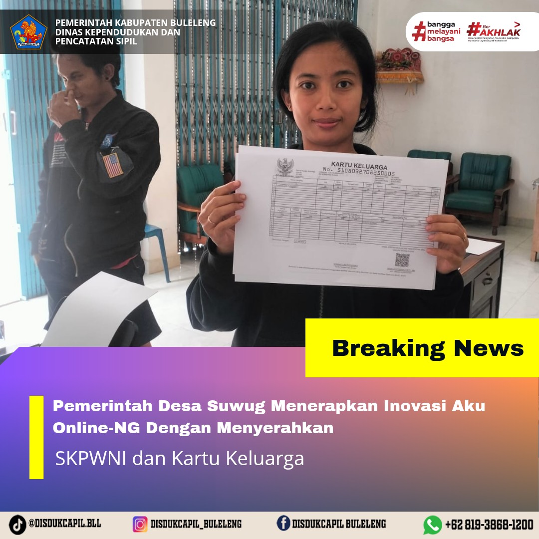 Pemerintah Kabupaten Buleleng melalui Dinas Kependudukan dan Pecatatan Sipil (Disdukcapil) Kabupaten Buleleng memaksimalkan serta mempermudah pelayanan kependudukan masyarakat dengan beberapa inovasi, melalui aplikasi AKU Online-NG. Dimana dalam penerapan aplikasi Aku Online-NG tersebut masyarakat tidak perlu lagi datang ke Dinas Dukcapil untuk melakukan pelayanan langsung cukup dengan datang ke Desa nanti akan dibantu oleh operator Desa masing-masing. Di Desa Suwug Kecamatan Sawan, telah diserahkan dokumen kependudukan berupa SKPWNI dan Kartu Keluarga yang diserahkan secara langsung oleh Pemerintahan Desa Suwug, Senin (6/10).