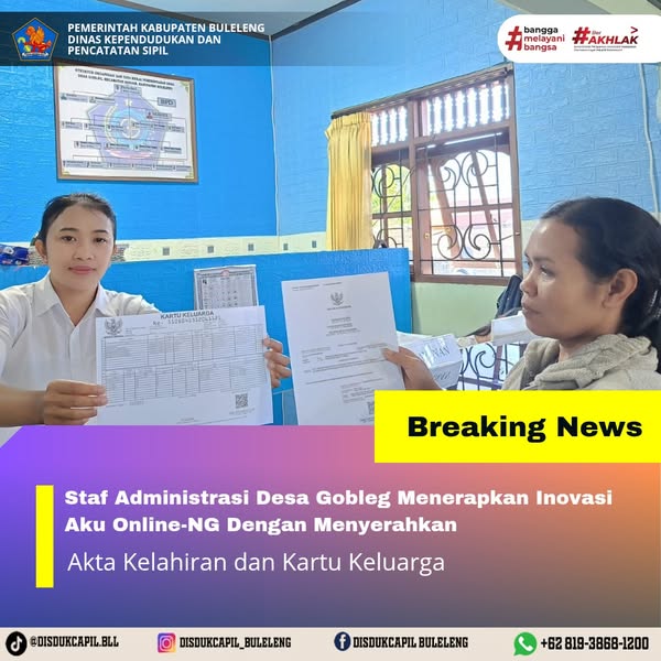 Pemerintah Kabupaten Buleleng melalui Dinas Kependudukan dan Pecatatan Sipil (Disdukcapil) Kabupaten Buleleng memaksimalkan serta mempermudah pelayanan kependudukan masyarakat dengan beberapa inovasi, melalui aplikasi AKU Online-NG. Dimana dalam penerapan aplikasi Aku Online-NG tersebut masyarakat tidak perlu lagi datang ke Dinas Dukcapil untuk melakukan pelayanan langsung cukup dengan datang ke Desa nanti akan dibantu oleh operator Desa masing-masing. Di Desa Gobleg Kecamatan Banjar, telah diserahkan dokumen kependudukan berupa Akta Kelahiran dan Kartu Keluarga atas nama Putu Geden yang diserahkan langsung oleh staf administrasi Desa Gobleg bertempat di Kantor Perbekel Desa Gobleg, Kecamatan Banjar, Kabupaten Buleleng, Selasa (2/7).