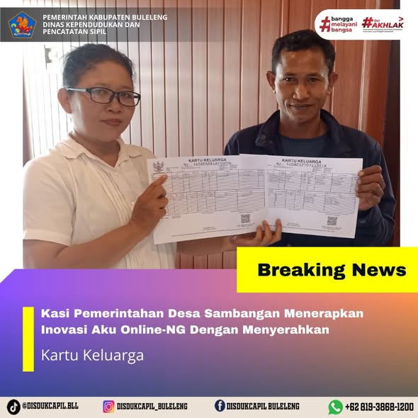 Pemerintah Kabupaten Buleleng melalui Dinas Kependudukan dan Pecatatan Sipil (Disdukcapil) Kabupaten Buleleng memaksimalkan serta mempermudah pelayanan kependudukan masyarakat dengan beberapa inovasi, melalui aplikasi AKU Online-NG. Dimana dalam penerapan aplikasi Aku Online-NG tersebut masyarakat tidak perlu lagi datang ke Dinas Dukcapil untuk melakukan pelayanan langsung cukup dengan datang ke Desa nanti akan dibantu oleh operator Desa masing-masing. Di Desa Sambangan Kecamatan Sukasada, telah diserahkan dokumen kependudukan berupa Kartu Keluarga atas nama Putu Tirta Yasa dan Dayu Made Tirta yang diserahkan oleh Kasi Pemerintahan Desa Sambangan kepada warga bertempat di Kantor Perbekel Desa Sambangan, Kecamatan Sukasada, Kabupaten Buleleng, Rabu (10/12).