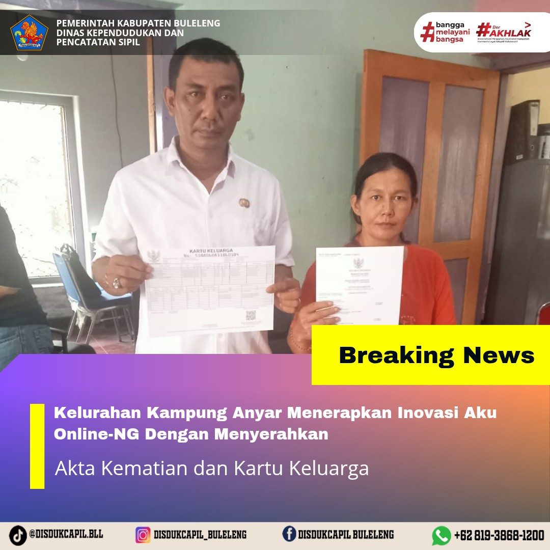 Pemerintah Kabupaten Buleleng melalui Dinas Kependudukan dan Pecatatan Sipil (Disdukcapil) Kabupaten Buleleng memaksimalkan serta mempermudah pelayanan kependudukan masyarakat dengan beberapa inovasi, melalui aplikasi AKU Online-NG. Dimana dalam penerapan aplikasi Aku Online-NG tersebut masyarakat tidak perlu lagi datang ke Dinas Dukcapil untuk melakukan pelayanan langsung cukup dengan datang ke Desa nanti akan dibantu oleh operator Desa masing-masing. Di Kelurahan Kampung Anyar Kecamatan Buleleng, telah diserahkan dokumen kependudukan berupa Akta Kematian atas nama I Ketut Karang yang diserahkan langsung oleh Kelurahan Kampung Anyar Kecamatan Buleleng, Kabupaten Buleleng, Rabu (24/12).