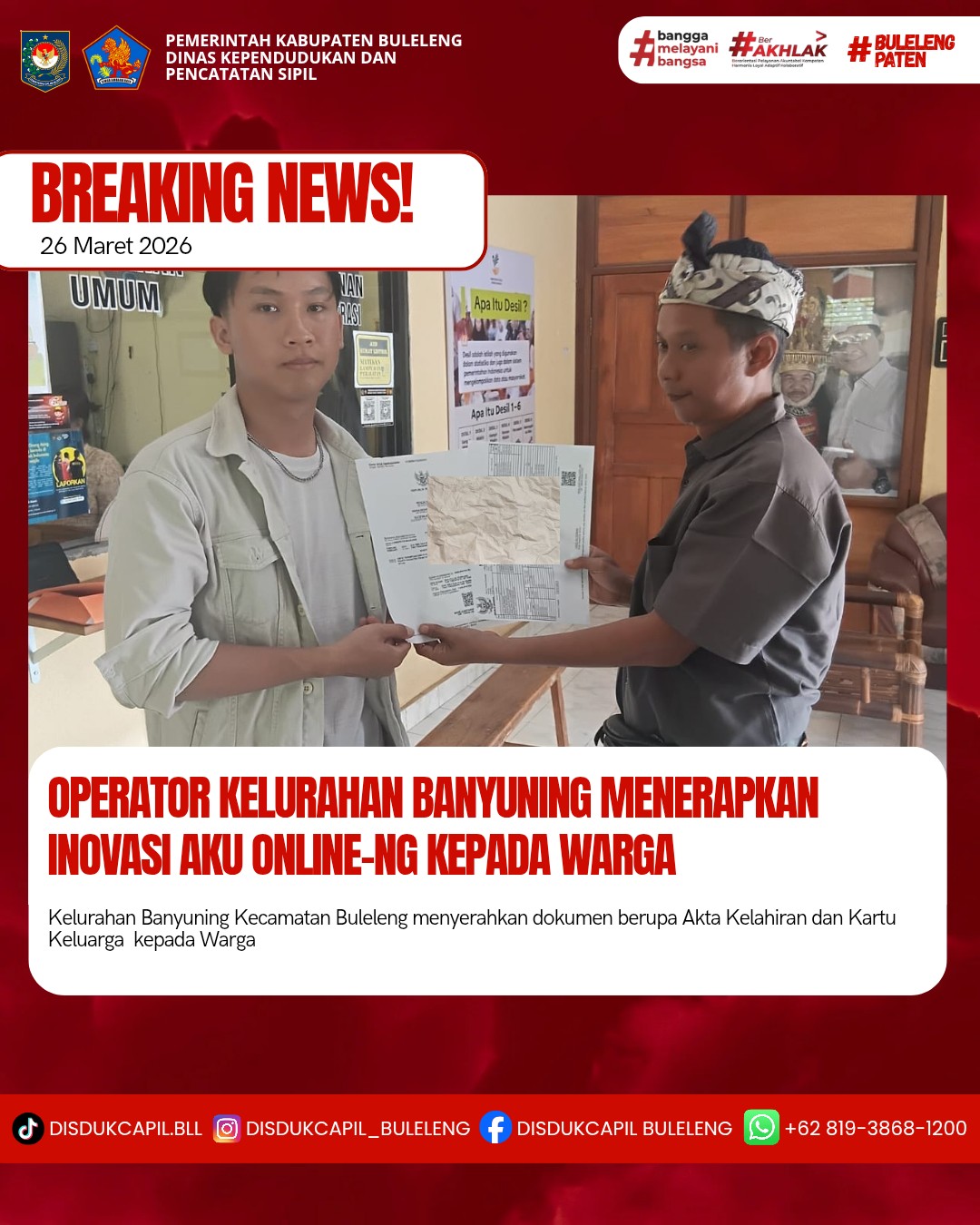 Pemerintah Kabupaten Buleleng melalui Dinas Kependudukan dan Pecatatan Sipil (Disdukcapil) Kabupaten Buleleng memaksimalkan serta mempermudah pelayanan kependudukan masyarakat dengan beberapa inovasi, melalui aplikasi AKU Online-NG. Dimana dalam penerapan aplikasi Aku Online-NG tersebut masyarakat tidak perlu lagi datang ke Dinas Dukcapil untuk melakukan pelayanan langsung, cukup dengan datang ke Desa nanti akan dibantu oleh operator Desa masing-masing. Di Kelurahan Banyuning Kecamatan Buleleng, telah diserahkan dokumen kependudukan berupa Tridatu Akta Kelahiran warga Kelurahan Banyuning yang diserahkan langsung oleh Operator Kelurahan Banyuning Kecamatan Buleleng, Kabupaten Buleleng, Kamis (25/3).