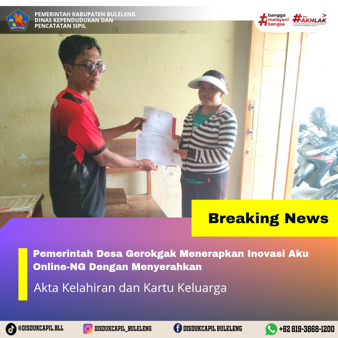 Pemerintah Kabupaten Buleleng melalui Dinas Kependudukan dan Pecatatan Sipil (Disdukcapil) Kabupaten Buleleng memaksimalkan serta mempermudah pelayanan kependudukan masyarakat dengan beberapa inovasi, melalui aplikasi AKU Online-NG. Dimana dalam penerapan aplikasi Aku Online-NG tersebut masyarakat tidak perlu lagi datang ke Dinas Dukcapil untuk melakukan pelayanan langsung cukup dengan datang ke Desa nanti akan dibantu oleh operator Desa masing-masing. Di Desa Gerokgak Kecamatan Gerokgak, telah diserahkan dokumen kependudukan berupa Akta Kelahiran atas nama Gusti Bagus Elvan Yudi Pradipta dan Kartu Keluarga atas nama Gusti Bagus Septianto yang diserahkan langsung oleh Kelian Banjar Dinas Pucaksari Desa Gerokgak Kecamatan Gerokgak, Kabupaten Buleleng, Jumat (2/1).