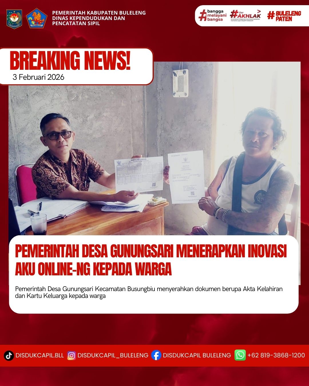 Pemerintah Kabupaten Buleleng melalui Dinas Kependudukan dan Pecatatan Sipil (Disdukcapil) Kabupaten Buleleng memaksimalkan serta mempermudah pelayanan kependudukan masyarakat dengan beberapa inovasi, melalui aplikasi AKU Online-NG. Dimana dalam penerapan aplikasi Aku Online-NG tersebut masyarakat tidak perlu lagi datang ke Dinas Dukcapil untuk melakukan pelayanan langsung cukup dengan datang ke Desa nanti akan dibantu oleh operator Desa masing-masing. Di Desa Gunungsari Kecamatan Seririt, telah diserahkan dokumen kependudukan berupa Akta Kelahiran atas nama KETUT RATNA DEWI dan Kartu Keluarga atas nama WAYAN ARTAWAN warga Banjar Dinas Sekar, Desa Gunungsari yang diserahkan oleh Pemerintah Desa Gunungsari kepada warga Banjar Dinas Sekar Desa Gunungsari, bertempat di Kantor Perbekel Desa Gunungsari, Kecamatan Seririt, Kabupaten Buleleng, Selasa (3/2).
