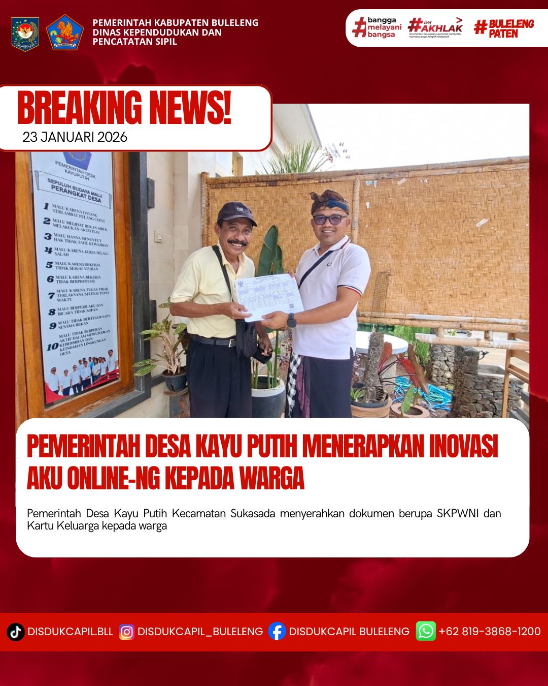 Pemerintah Kabupaten Buleleng melalui Dinas Kependudukan dan Pecatatan Sipil (Disdukcapil) Kabupaten Buleleng memaksimalkan serta mempermudah pelayanan kependudukan masyarakat dengan beberapa inovasi, melalui aplikasi AKU Online-NG. Dimana dalam penerapan aplikasi Aku Online-NG tersebut masyarakat tidak perlu lagi datang ke Dinas Dukcapil untuk melakukan pelayanan langsung cukup dengan datang ke Desa nanti akan dibantu oleh operator Desa masing-masing. Di Desa Kayu Putih Kecamatan Sukasada, telah diserahkan dokumen kependudukan berupa SKPWNI dan Kartu Keluarga atas nama VICTORY CHRISTIAN SOUMOKIL.ir warga Banjar Dinas Sinalud, Desa Kayu Putih, Kecamatan Sukasada yang diserahkan secara langsung oleh Kaur Perencanaan Desa Kayu Putih Kecamatan Sukasada, Jumat (23/1).