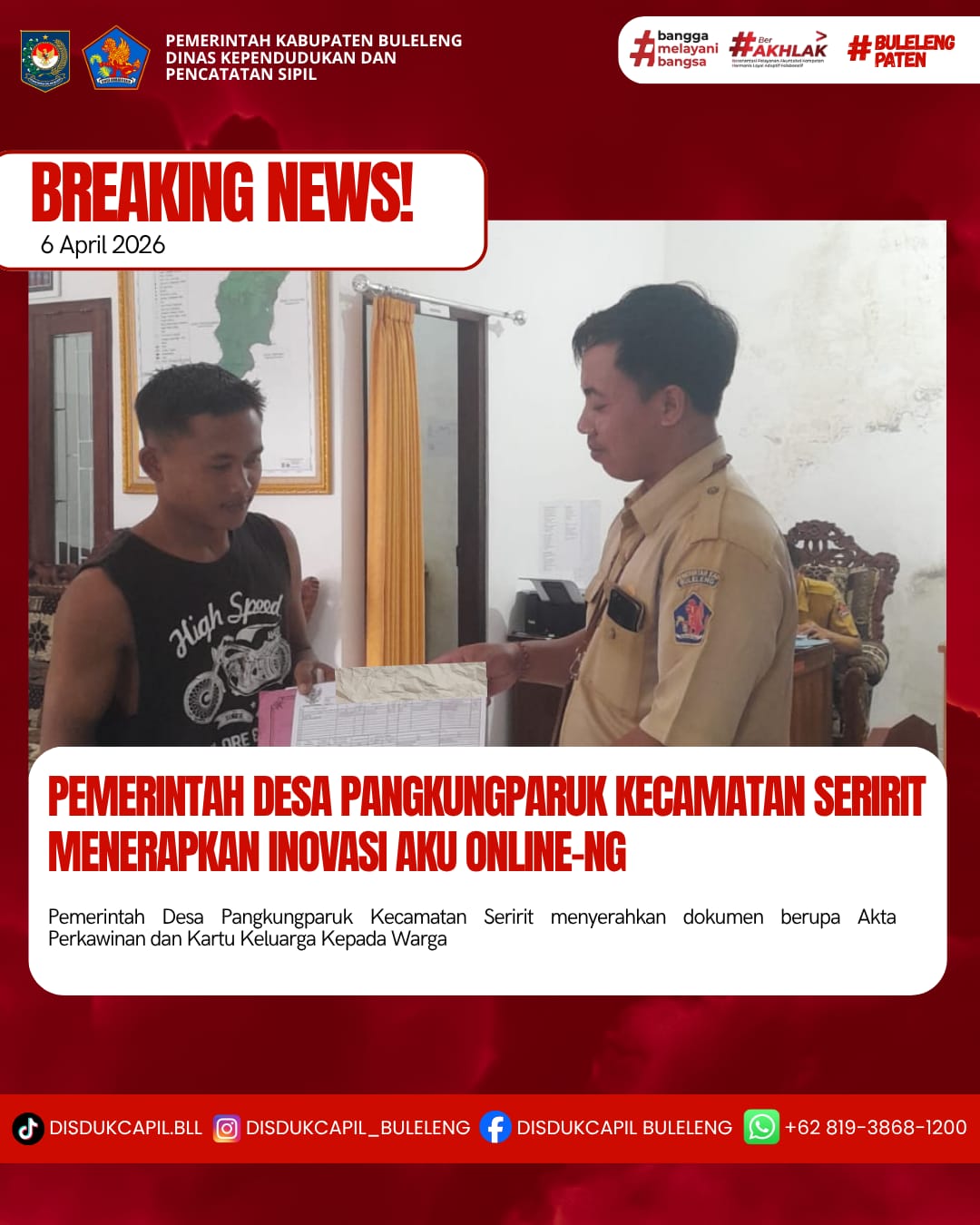 Pemerintah Kabupaten Buleleng melalui Dinas Kependudukan dan Pecatatan Sipil (Disdukcapil) Kabupaten Buleleng memaksimalkan serta mempermudah pelayanan kependudukan masyarakat dengan beberapa inovasi, melalui aplikasi AKU Online-NG. Dimana dalam penerapan aplikasi Aku Online-NG tersebut masyarakat tidak perlu lagi datang ke Dinas Dukcapil untuk melakukan pelayanan langsung, cukup dengan datang ke Desa nanti akan dibantu oleh operator Desa masing-masing. Di Desa Pangkungparuk Kecamatan Seririt, telah diserahkan dokumen kependudukan berupa Akta Perkawinan Gede Edi dan Kadek Sri Andayani banjar dinas lebah mantung,Desa Pangkungparuk yang diserahkan oleh Kepala Dusun Desa Pangkungparuk , Senin (6/4).