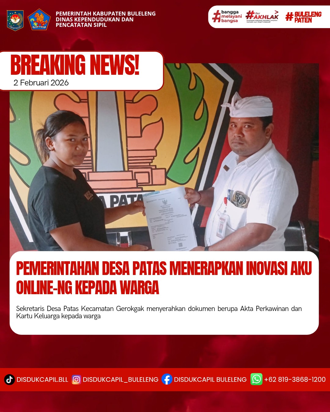Pemerintah Kabupaten Buleleng melalui Dinas Kependudukan dan Pecatatan Sipil (Disdukcapil) Kabupaten Buleleng memaksimalkan serta mempermudah pelayanan kependudukan masyarakat dengan beberapa inovasi, melalui aplikasi AKU Online-NG. Dimana dalam penerapan aplikasi Aku Online-NG tersebut masyarakat tidak perlu lagi datang ke Dinas Dukcapil untuk melakukan pelayanan langsung cukup dengan datang ke Desa nanti akan dibantu oleh operator Desa masing-masing. Di Desa Patas Kecamatan Gerokgak, telah diserahkan dokumen kependudukan berupa Akta Perkawinan dan Kartu Keluarga atas nama Kadek Edi Sudiawan warga Banjar Dinas Mertasari yang diserahkan oleh Sekretaris Desa Patas kepada warga Banjar Dinas Mertasari Desa Patas Kecamatan Gerokgak, Senin (2/2).