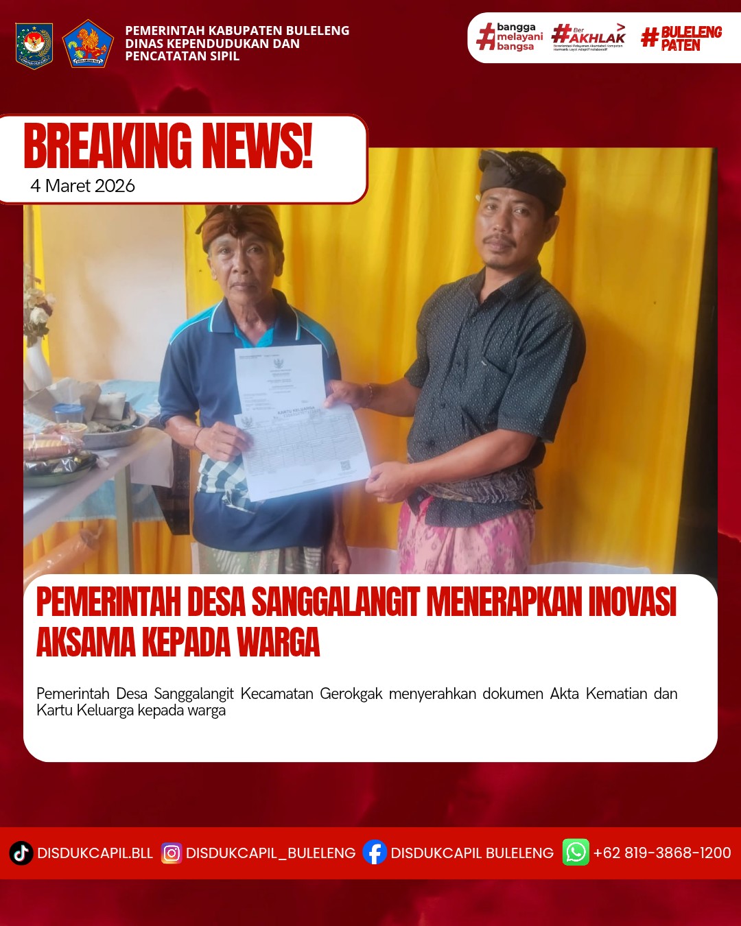 Pemerintah Kabupaten Buleleng melalui Dinas Kependudukan dan Pecatatan Sipil (Disdukcapil) Kabupaten Buleleng memaksimalkan serta mempermudah pelayanan kependudukan masyarakat dengan beberapa inovasi, yakni BALITA (Bayi Lahir Berakta), NYAKSI (Menyerahkan Akta Kawin Saat Acara Perkawinan) dan AKSAMA ( Akta Kematian Diserahkan Saat Masih Berduka) melalui aplikasi Aku Online-NG. Di Desa Sanggalangit Kecamatan Gerokgak, telah diterapkan program Aksama (Akta Kematian Diserahkan Saat Masih Berduka) yang dilakukan secara langsung oleh Kelian Banjar Dinas Tukadpule Desa Sanggalangit dengan menyerahkan Akta Kematian dan Kartu Keluarga kepada I Wayan Wardika di Banjar Dinas Tukadpule Desa Sanggalangit Kecamatan Gerokgak, Rabu (4/3).