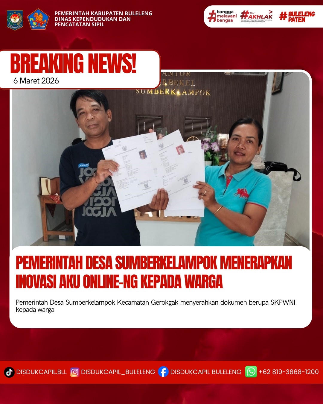 Pemerintah Kabupaten Buleleng melalui Dinas Kependudukan dan Pecatatan Sipil (Disdukcapil) Kabupaten Buleleng memaksimalkan serta mempermudah pelayanan kependudukan masyarakat dengan beberapa inovasi, melalui aplikasi AKU Online-NG. Dimana dalam penerapan aplikasi Aku Online-NG tersebut masyarakat tidak perlu lagi datang ke Dinas Dukcapil untuk melakukan pelayanan langsung cukup dengan datang ke Desa nanti akan dibantu oleh operator Desa masing-masing. Di Desa Sumberklampok Kecamatan Gerokgak, telah diserahkan dokumen kependudukan berupa SKPWNI atas nama I Nyoman Suastika yang diserahkan secara langsung oleh Anggota BPD Ibu Gusti Ayu Putu Eka Arya Wiratmini bertempat di Kantor Perbekel Desa Sumberklampok, Kecamatan Gerokgak, Senin (5/1).