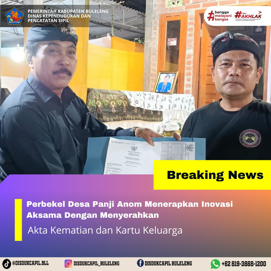 Pemerintah Kabupaten Buleleng melalui Dinas Kependudukan dan Pecatatan Sipil (Disdukcapil) Kabupaten Buleleng memaksimalkan serta mempermudah pelayanan kependudukan masyarakat dengan beberapa inovasi, yakni BALITA (Bayi Lahir Berakta), NYAKSI (Menyerahkan Akta Kawin Saat Acara Perkawinan) dan AKSAMA ( Akta Kematian Diserahkan Saat Masih Berduka) melalui aplikasi Aku Online. Di Desa Panji Anom Kecamatan Sukasada, telah diterapkan program Aksama (Akta Kematian Diserahkan Saat Masih Berduka) yang dilakukan secara langsung oleh Perbekel Desa Panji Anom I Nyoman Mustanda dengan menyerahkan Akta Kematian atas nama WAYAN WANDRES dan Kartu Keluarga atas nama MADE SINDRI kepada keluarga almarhum yang beralamat Banjar Dinas Pancoran, Desa Panji Anom, Kecamatan Sukasada, Selasa (18/11).
