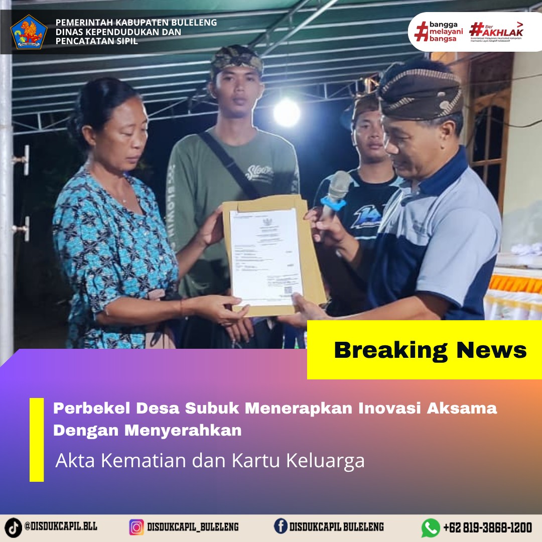 Pemerintah Kabupaten Buleleng melalui Dinas Kependudukan dan Pecatatan Sipil (Disdukcapil) Kabupaten Buleleng memaksimalkan serta mempermudah pelayanan kependudukan masyarakat dengan beberapa inovasi, yakni BALITA (Bayi Lahir Berakta), NYAKSI (Menyerahkan Akta Kawin Saat Acara Perkawinan) dan AKSAMA ( Akta Kematian Diserahkan Saat Masih Berduka) melalui aplikasi Aku Online. Di Desa Subuk Kecamatan Busungbiu, telah diterapkan program Aksama (Akta Kematian Diserahkan Saat Masih Berduka) yang dilakukan secara langsung oleh Perbekel Desa Subuk KETUT SULIADA KUSANA dengan menyerahkan Akta Kematian atas nama MADE JENEK dan Kartu Keluarga yang diterima langsung oleh keluarganya di Desa Subuk, Kecamatan Busungbiu, Jumat (17/10).