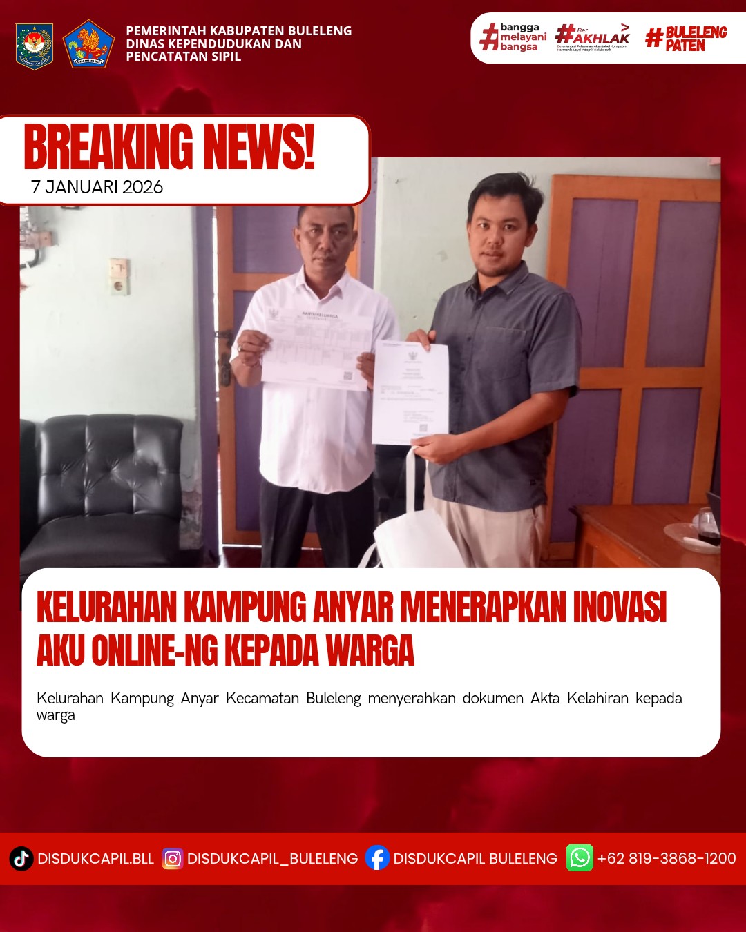 Pemerintah Kabupaten Buleleng melalui Dinas Kependudukan dan Pecatatan Sipil (Disdukcapil) Kabupaten Buleleng memaksimalkan serta mempermudah pelayanan kependudukan masyarakat dengan beberapa inovasi, melalui aplikasi AKU Online-NG. Dimana dalam penerapan aplikasi Aku Online-NG tersebut masyarakat tidak perlu lagi datang ke Dinas Dukcapil untuk melakukan pelayanan langsung cukup dengan datang ke Desa nanti akan dibantu oleh operator Desa masing-masing. Di Kelurahan Kampung Anyar Kecamatan Buleleng, telah diserahkan dokumen kependudukan berupa Akta Kelahiran atas nama Elyas Fatona yang diserahkan langsung oleh Kelurahan Kampung Anyar Kecamatan Buleleng, Kabupaten Buleleng, Rabu (7/1).
