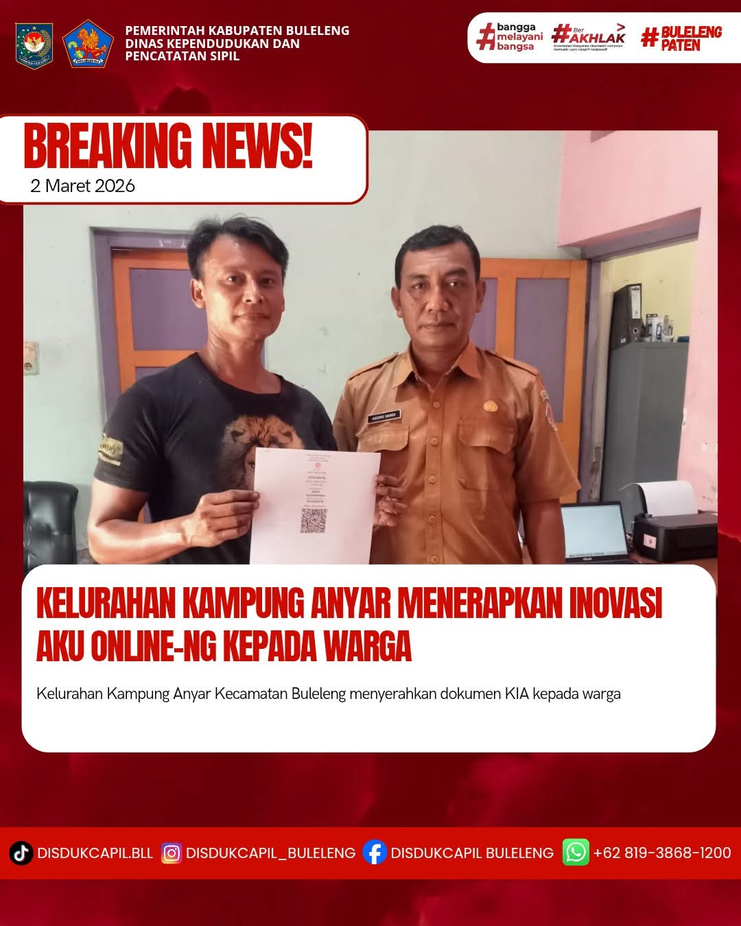 Pemerintah Kabupaten Buleleng melalui Dinas Kependudukan dan Pecatatan Sipil (Disdukcapil) Kabupaten Buleleng memaksimalkan serta mempermudah pelayanan kependudukan masyarakat dengan beberapa inovasi, melalui aplikasi AKU Online-NG. Dimana dalam penerapan aplikasi Aku Online-NG tersebut masyarakat tidak perlu lagi datang ke Dinas Dukcapil untuk melakukan pelayanan langsung cukup dengan datang ke Desa nanti akan dibantu oleh operator Desa masing-masing. Di Kelurahan Kampung Anyar Kecamatan Buleleng, telah diserahkan dokumen kependudukan berupa KIA atas nama Made Sudarmawan yang diserahkan langsung oleh Kelurahan Kampung Anyar Kecamatan Buleleng, Kabupaten Buleleng, Senin (2/3).